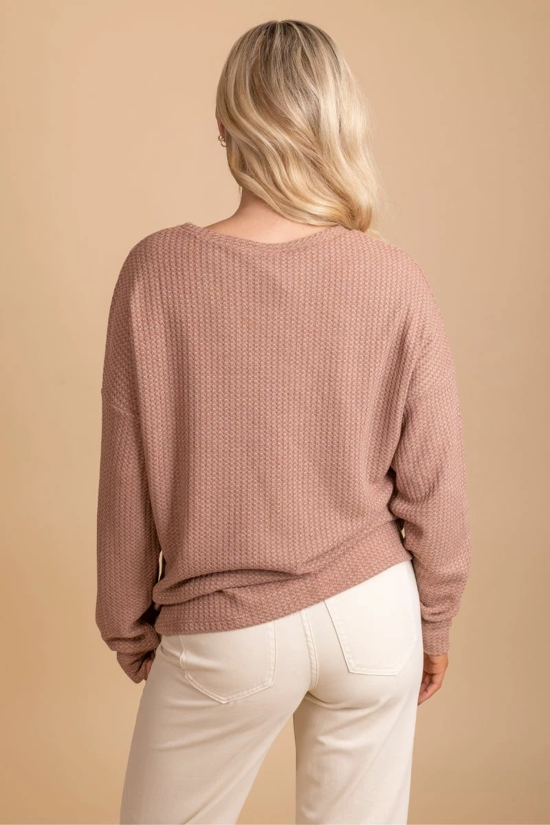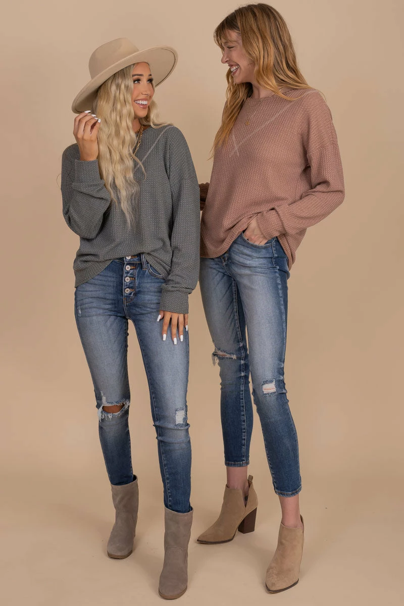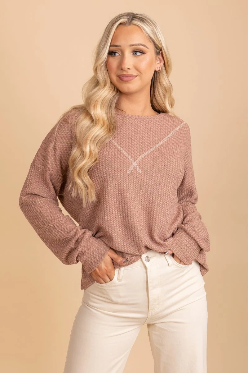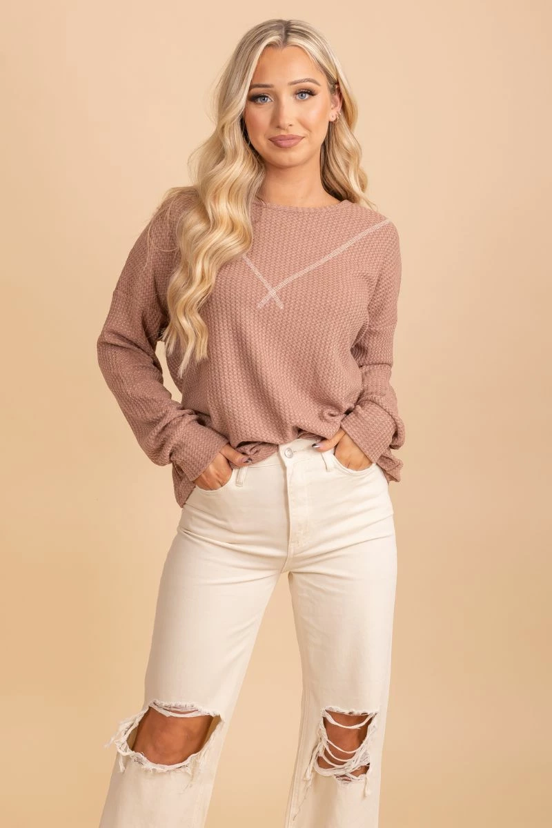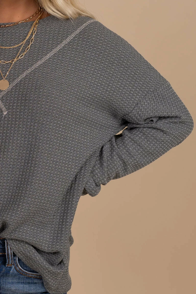 Our new Winds of Winter Waffle Knit Top is the perfect seasonal top! We’re obsessed with the waffle knit material, two trendy color options, and the stitched details on the neckline! The cozy material will keep you warm all season long! Pair your Winds of Winter Waffle Knit Top with your favorite jeans and booties to create a gorgeous winter outfit!