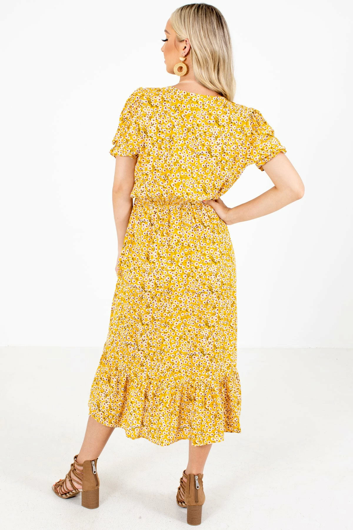 Say hello to summer in our new Sunshine Goddess Yellow Floral Midi Dress! This midi length dress is yellow and features a multicolored floral pattern. We’re obsessed with the decorative buttons, v-neckline, and elastic waistband! The lightweight, high-quality material creates a comfortable and flattering silhouette. Pair our Sunshine Goddess Yellow Floral Midi Dress with heeled sandals!