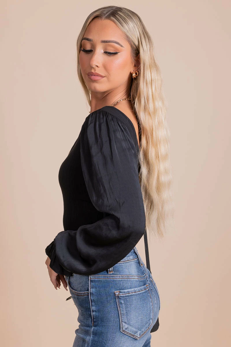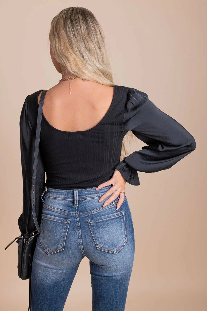 Our new First Kiss Long Sleeve Bodysuit is a fall must-have! This bodysuit features long sleeves, textured ribbed material, and two cute color options! The wide, round neckline and low back make this bodysuit so cute! Pair your First Kiss Long Sleeve Bodysuit with your favorite jeans to recreate our models outfit!
