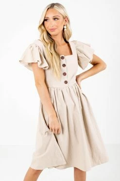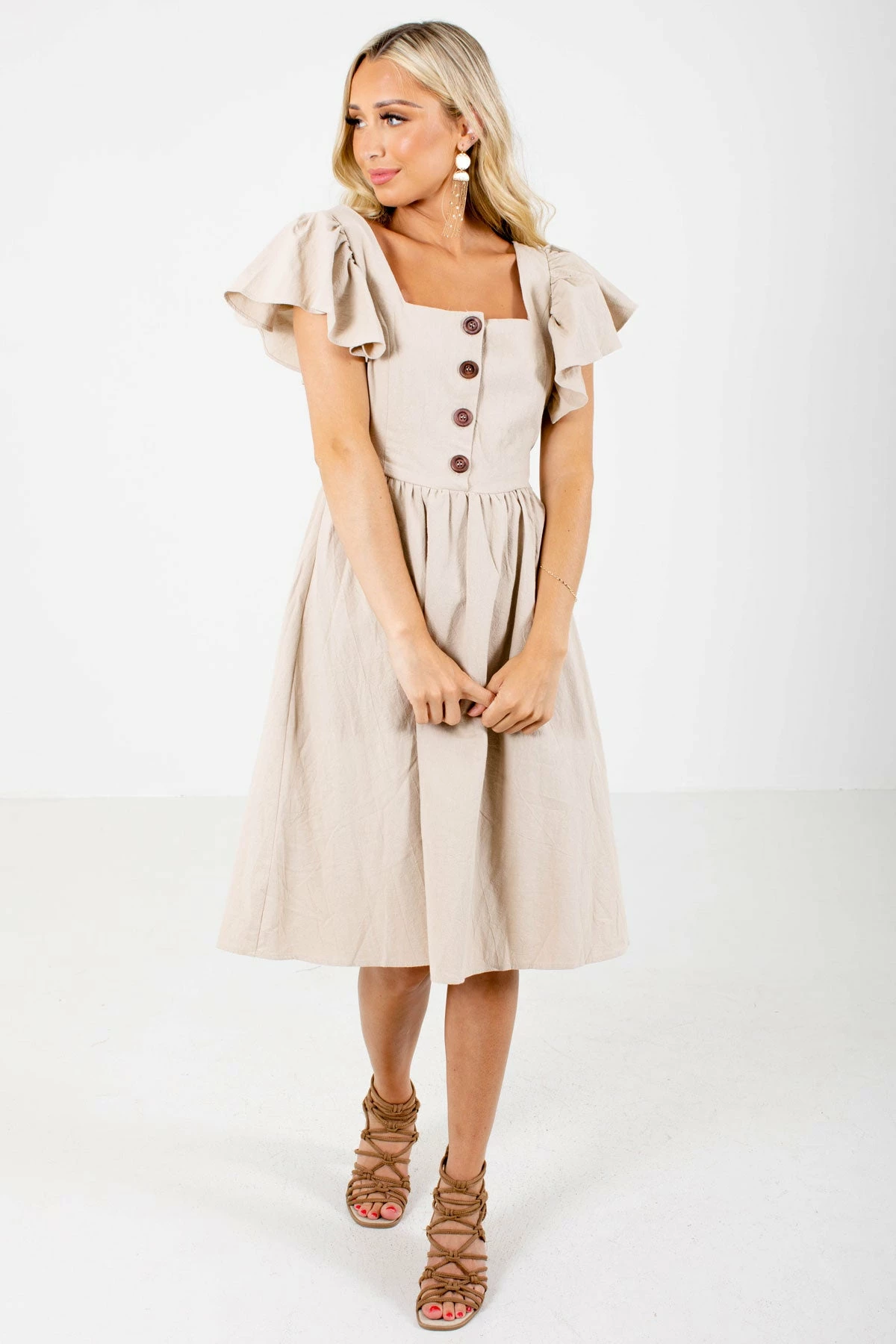 Our Smooth Sailing Taupe Knee-Length Dress will quickly become your new favorite piece! This knee-length dress is a solid taupe brown color. It features a button-up bodice, waist tie detail, and flutter style sleeves! The high-quality material and interior lining work together to make this dress comfortable and easy to wear. Pair our Smooth Sailing Taupe Knee-Length Dress with your favorite heeled sandals!