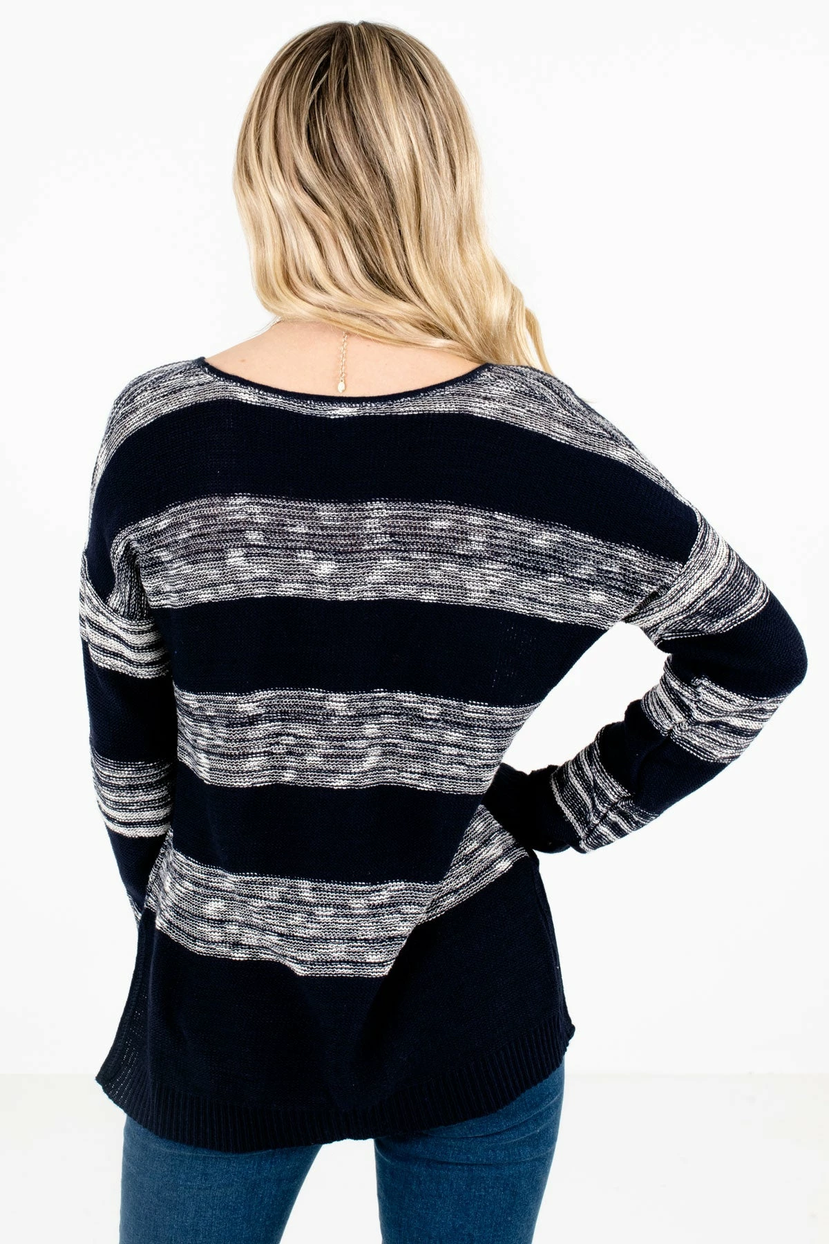 Our Brave the Storm Navy Striped Sweater is composed of 100% Acrylic. Hand wash cold. Hang or lay flat to dry. Please do not bleach. - Our model, Madelyn, is 5’5″ and wearing a size small.