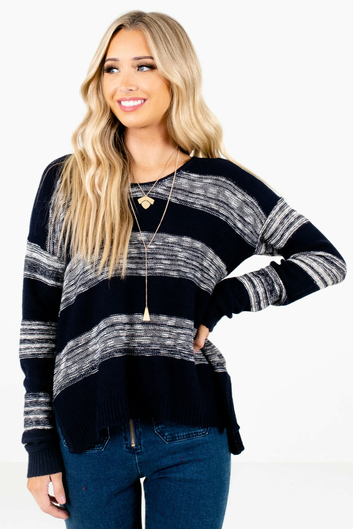 Our new Brave the Storm Navy Striped Sweater is a must-have! This adorable sweater features a navy blue and heathered white striped pattern. The lightweight, high-quality knit material is perfect for layering! We’re obsessed with the split high-low hem. Pair our Brave the Storm Navy Striped Sweater with your favorite skinny jeans and booties to recreate our model’s trendy outfit!