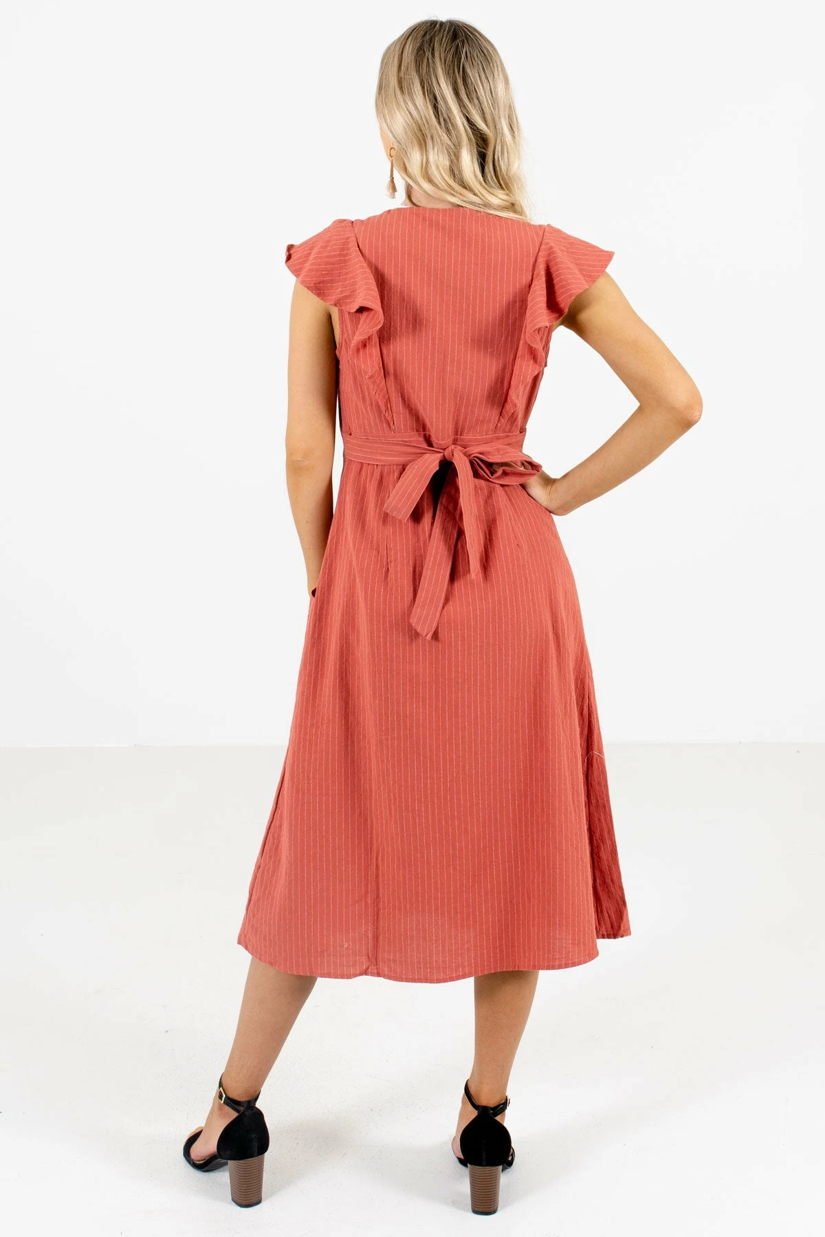 We love our new Break The Rules Orange Striped Midi Dress and all of its unique details! This midi length dress is orange with a white striped pattern. It features a button-up front, waist tie detail, and pockets! The thick, high-quality material and partial lining create a comfortable fit. We’re in love with the deep v-neckline and ruffled sleeves that add a flirty finishing touch! Pair the Break The Rules Orange Striped Midi Dress with heeled sandals to create the perfect summertime look!