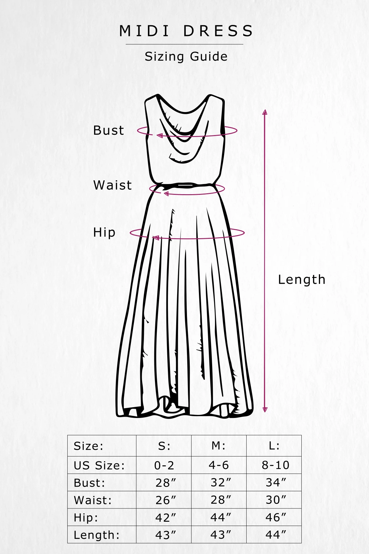 Measurements: US Size Bust Waist Hip Length S 0-2 28″ 26″ 42″ 43″ M 4-6 32″ 28″ 44″ 43″ L 8-10 34″ 30″ 46″ 44″ For more information on how to choose the perfect size, check out our size guide.
