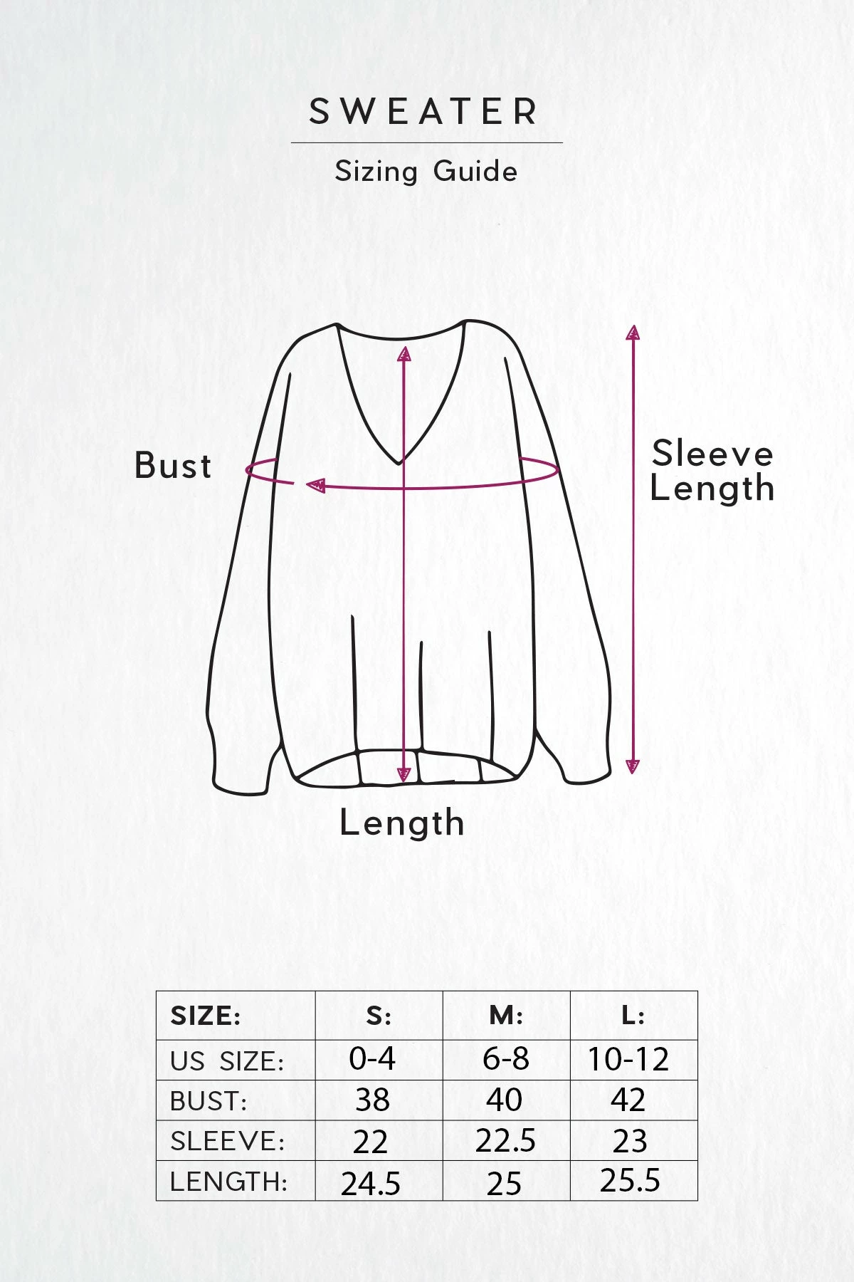 Measurements: US Size Bust Waist Sleeve Length S 0-4 38″ 38″ 22″ 24.5″ M 6-8 40″ 40″ 22.5″ 25″ L 10-12 42″ 42″ 23″ 25.5″ For more information on how to choose the perfect size, check out our size guide.