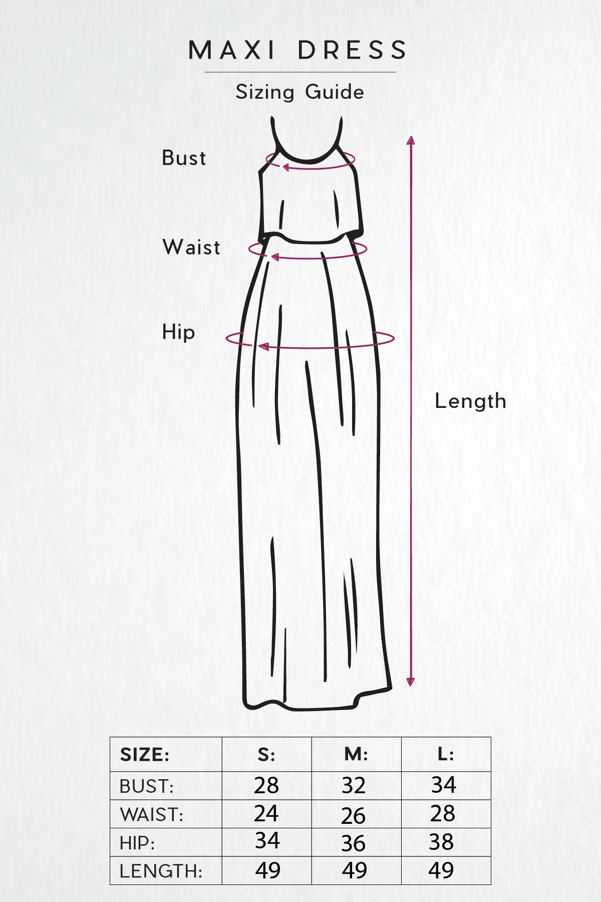 Measurements: US Size Bust Waist Hip Length S 0-4 28″ 24″ 34″ 49″ M 8-6 32″ 26″ 36″ 49″ L 10-12 34″ 28″ 38″ 49″ For more information on how to choose the perfect size, check out our size guide.