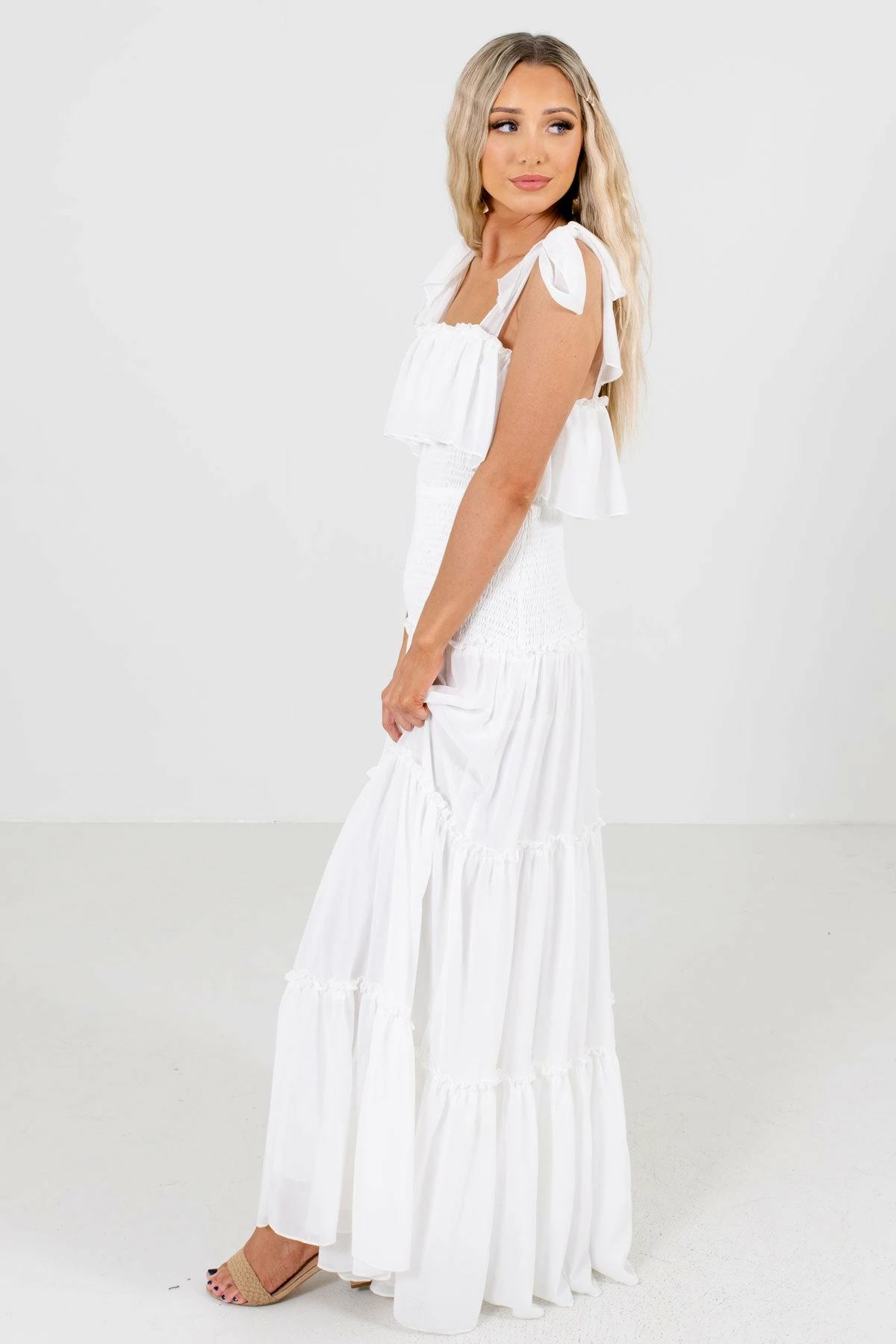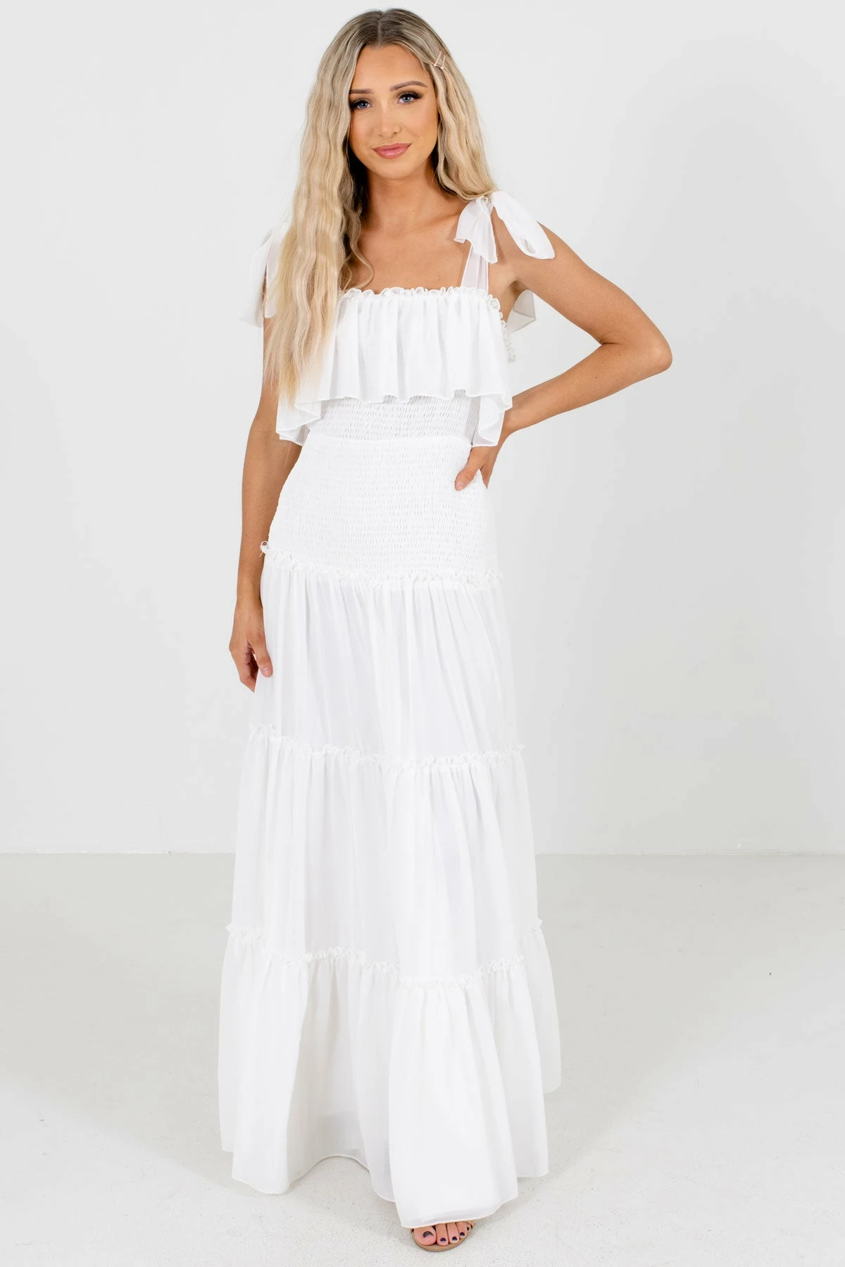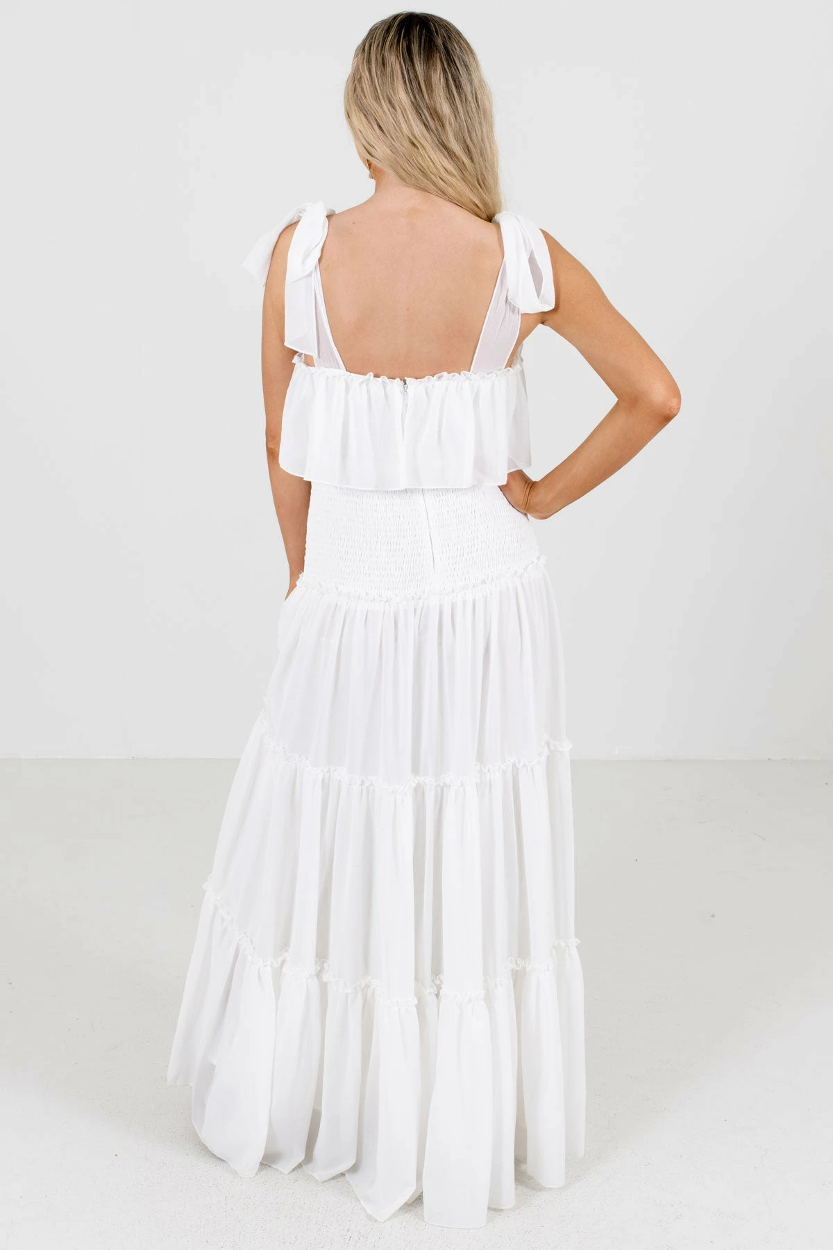 Our new Feel the Romance White Maxi Dress is absolutely gorgeous! This maxi length dress is a solid white color. It features high-quality material that creates a flattering silhouette. We’re in love the the smocked bodice, self-tie straps, and ruffled accents! The back zipper and partial lining add the perfect finishing touches. Pair our Feel the Romance White Maxi Dress with neutral-colored heels to create a beautiful outfit that’ll be perfect for your next special occasion!