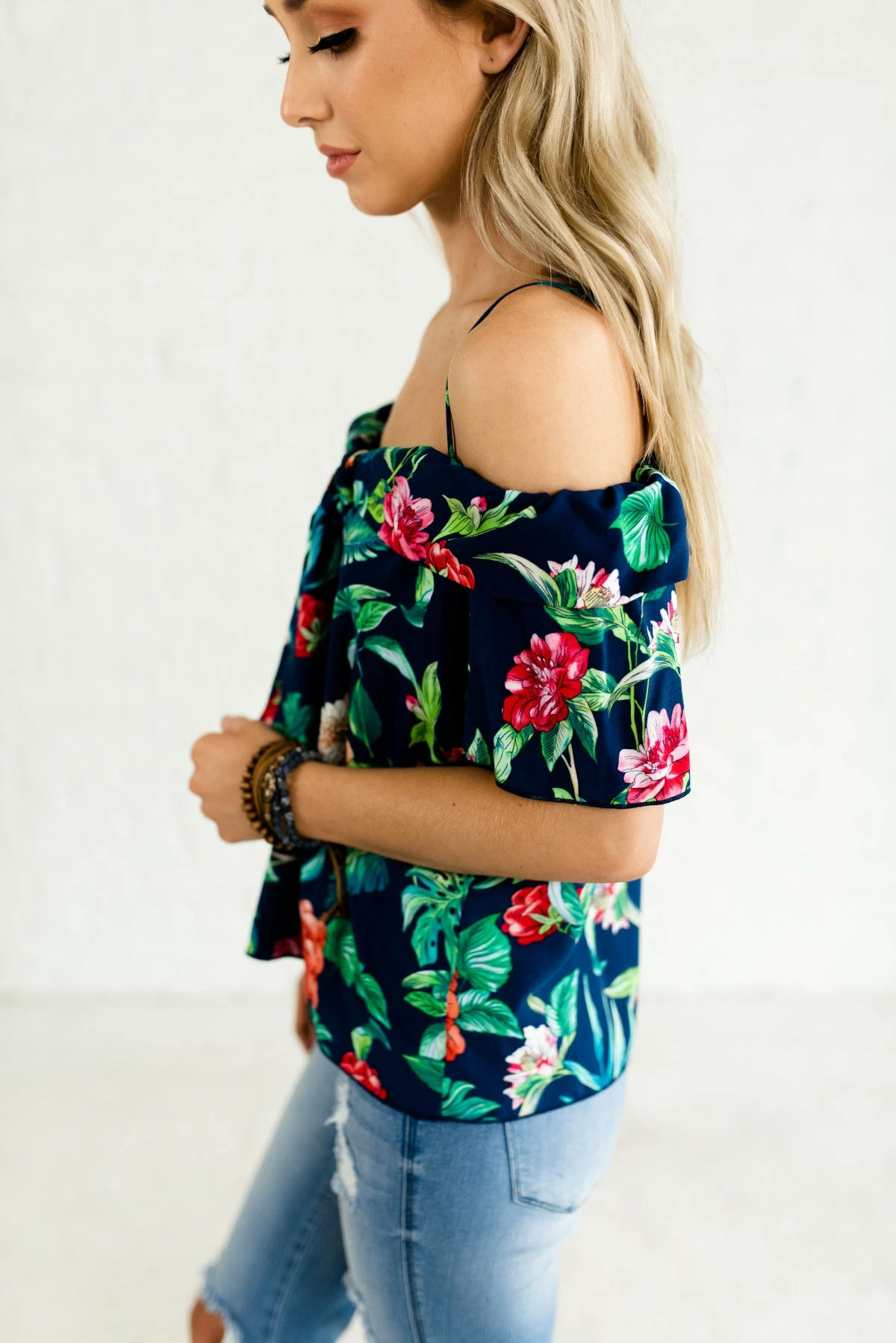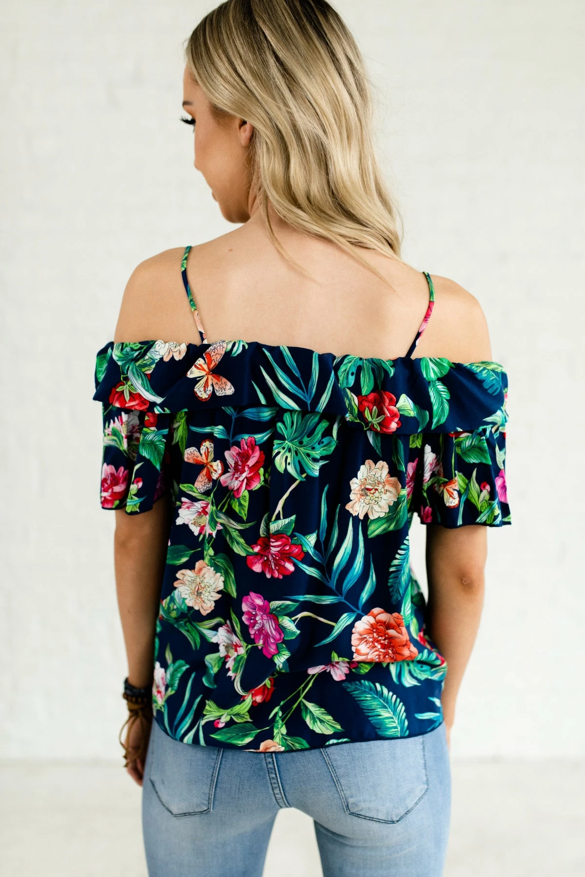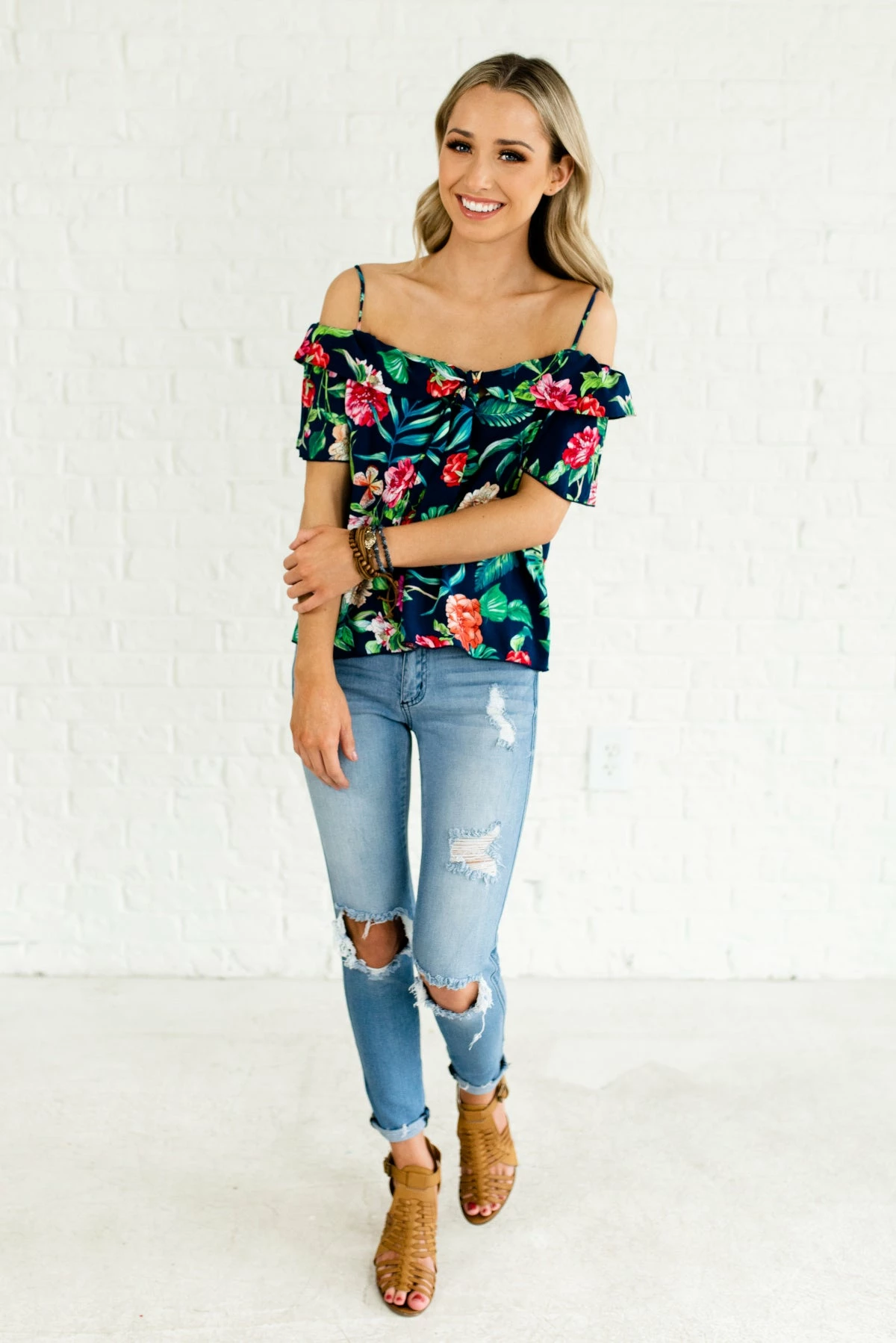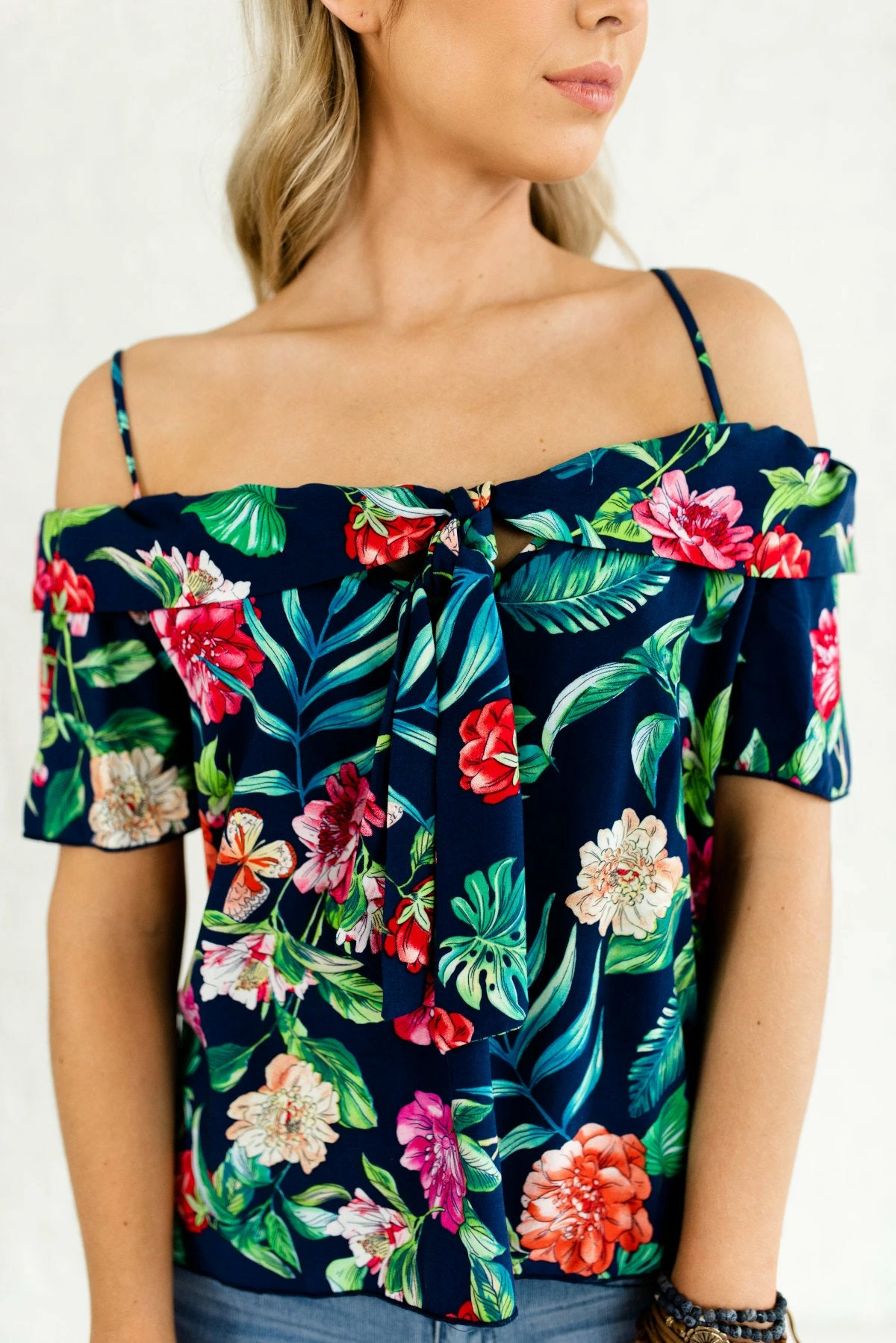 Our new Island Dreaming Navy Cold Shoulder Top has the cutest details! It is a navy blue color with the prettiest pink, red, orange, and green tropical floral print. This cute top features an cold shoulder style, subtle sweetheart neckline, and a flowy silhouette. Our favorite part of this top is the front tie neckline detail that can be tied and adjusted to your liking! You’ll love the high-quality, lightweight material that makes this top perfect for warm weather and tropical vacations. Pair our Island Dreaming Navy Cold Shoulder Top with denim shorts and sandals for a fun, summery look!
