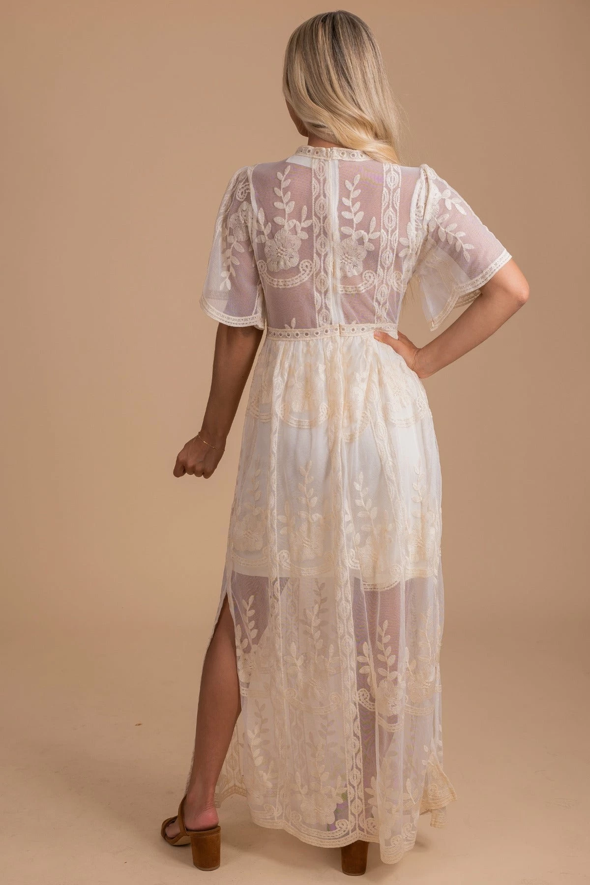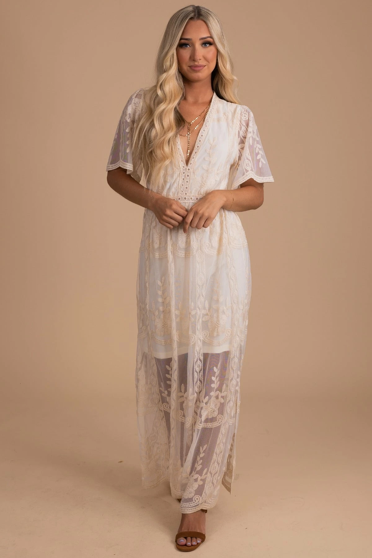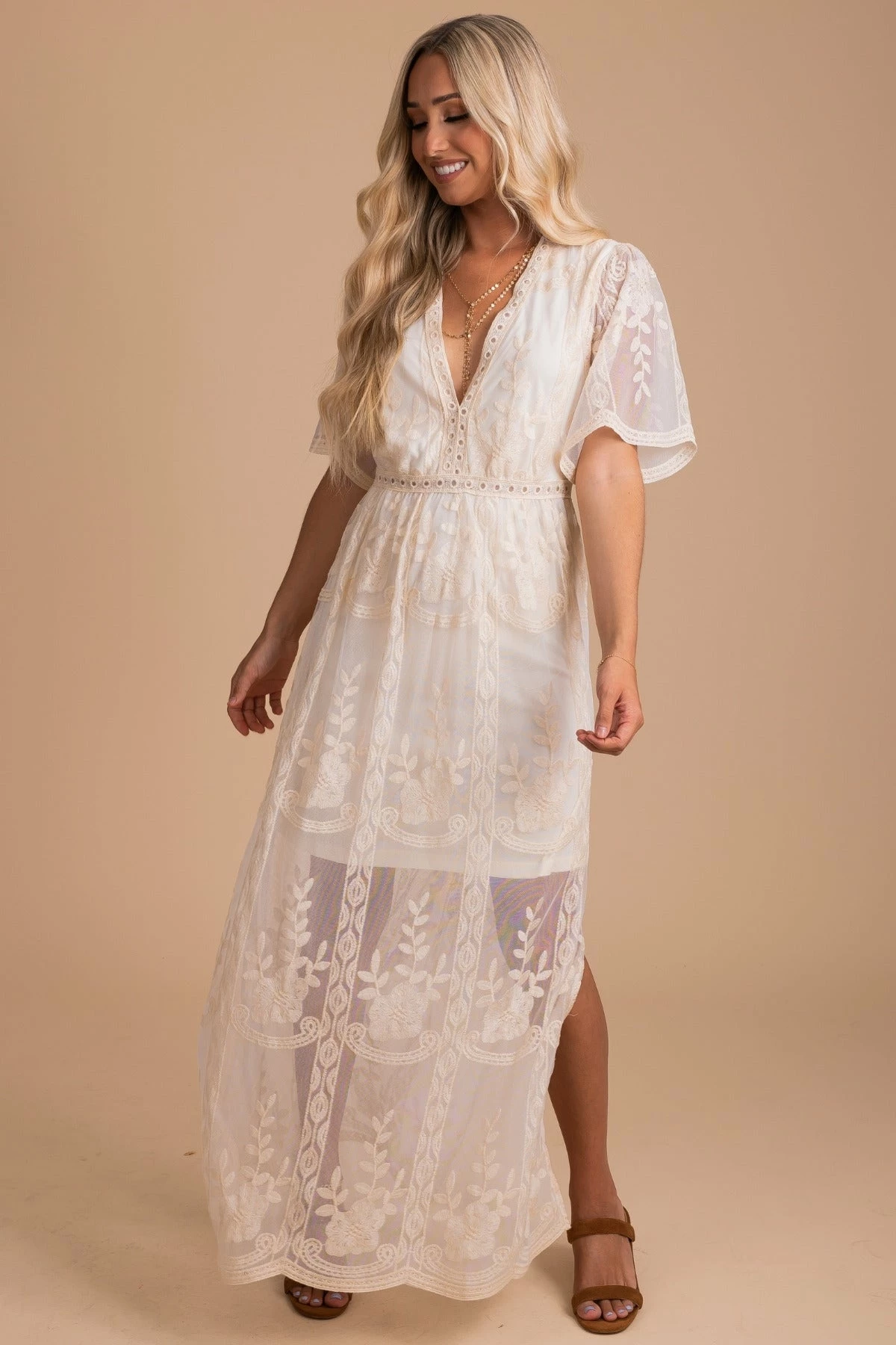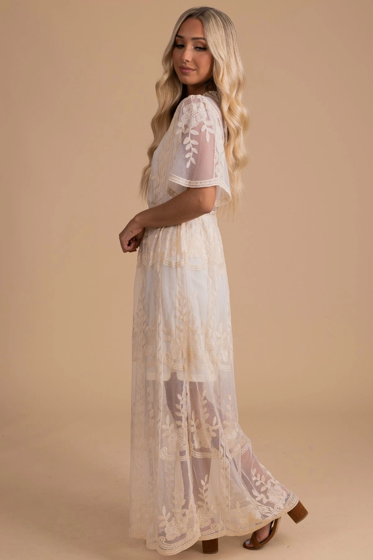 The Light My Fire Cream White Lace Maxi Dress would be beautiful for your next special occasion. It’s perfect for a bridesmaid dress, wedding guest dress, or bridal shower dress.
