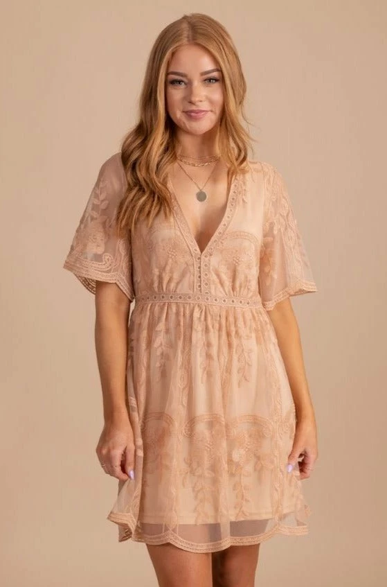 Bella Ella Boutique Light My Fire Tan Lace Mini Dress