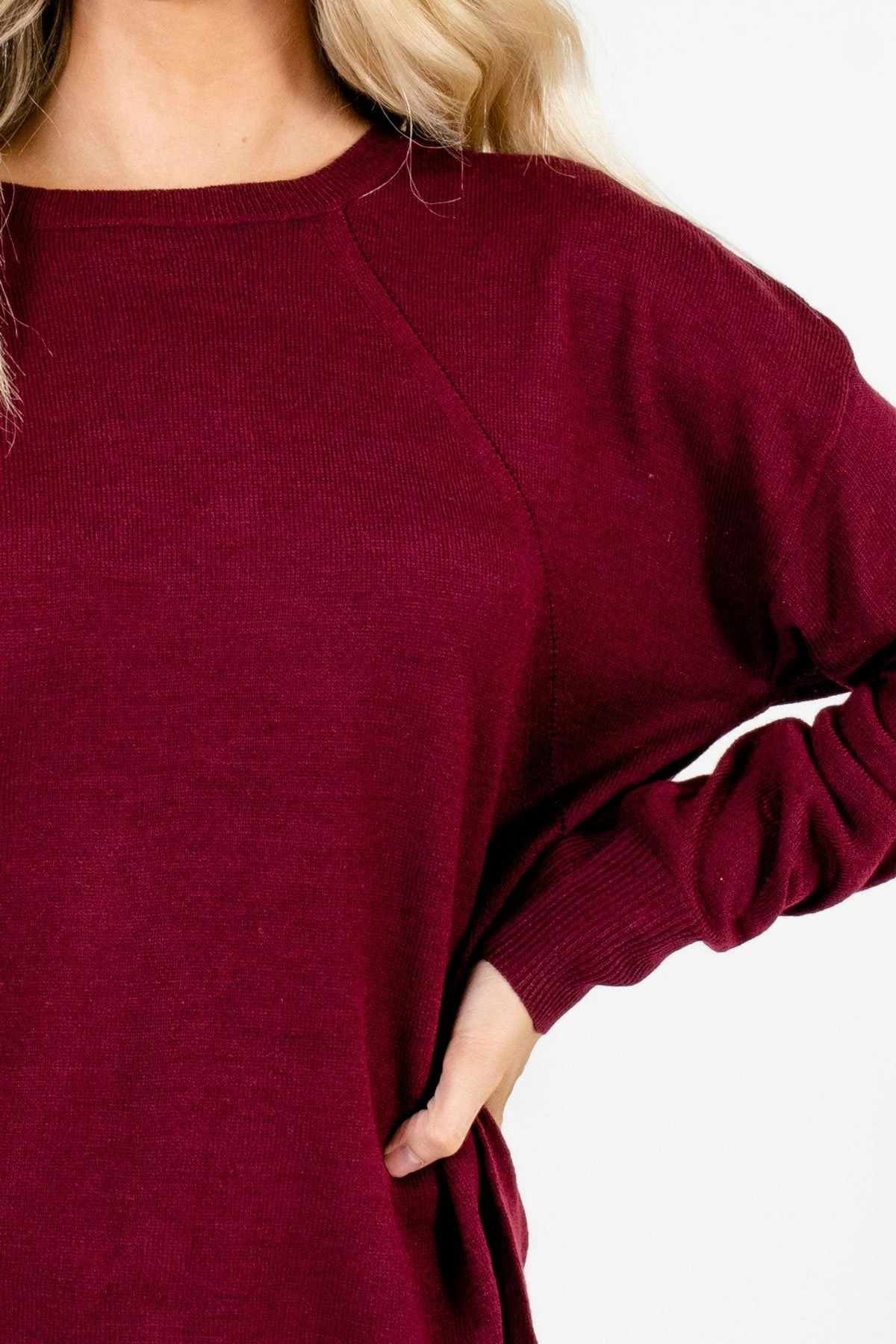 The Lost in Thought Burgundy Sweater is composed of 100% Acrylic. Hand wash cold. Hang or lay flat to dry. Please do not bleach.