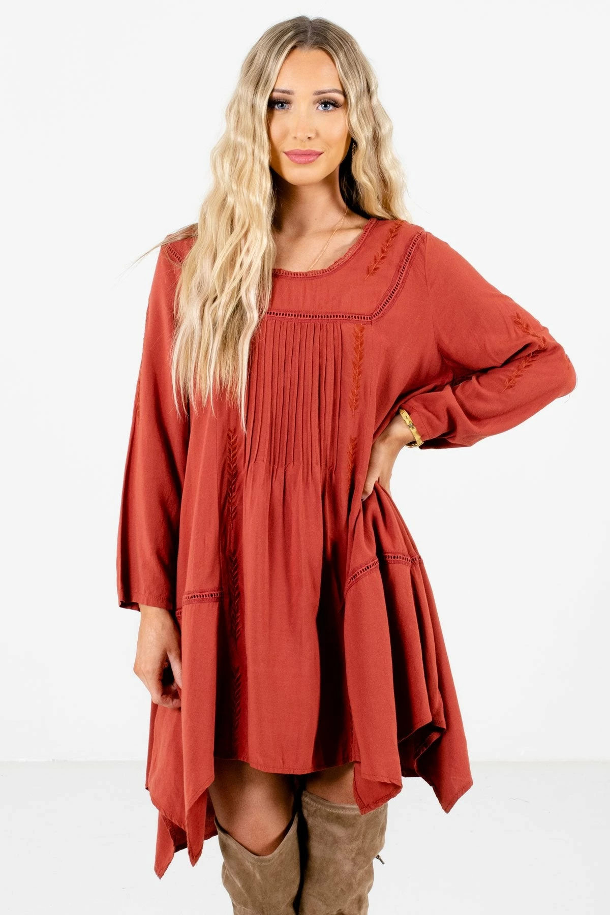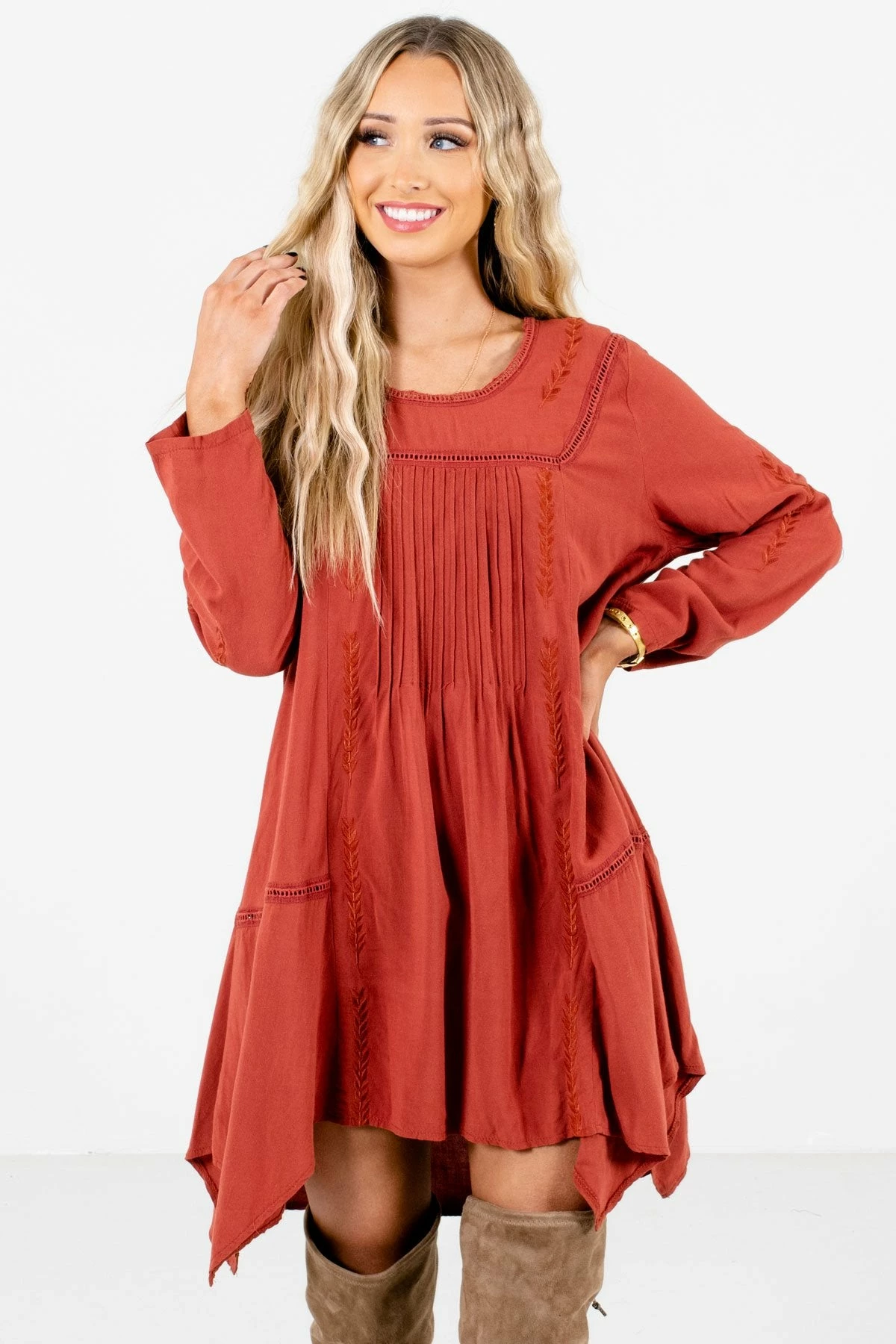 Our new Love of My Life Rust Orange Mini Dress is bohemian chic! This beautiful dress is a solid rust orange color that’s perfect for the upcoming season. It features a round neckline, long sleeves, and high-quality, lightweight material! We’re obsessed with the ladder lace, crochet detailing, and pleated accents. The asymmetrical hem perfectly completes the look. Pair our Love of My Life Rust Orange Mini Dress with tan booties!