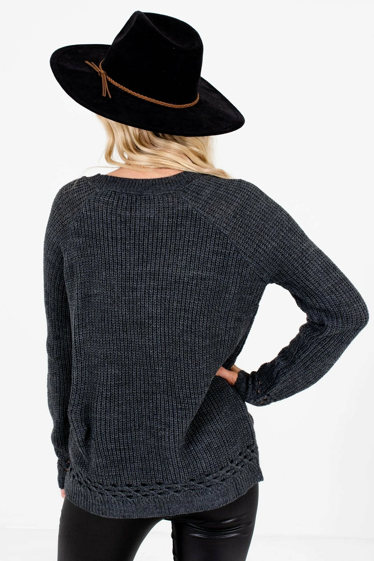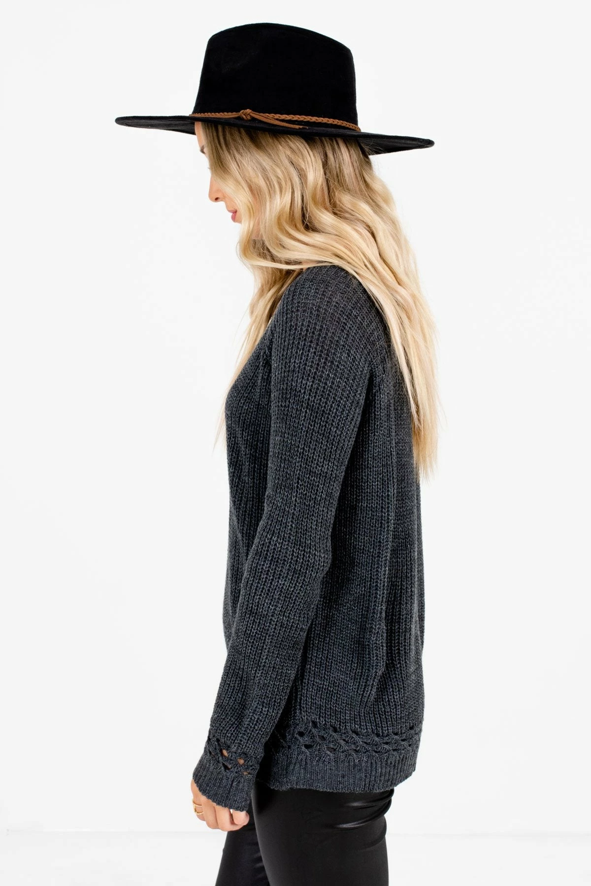 The Make a Change Charcoal Gray Sweater is composed of 100% Acrylic. Hand wash cold. Hang or lay flat to dry. Please do not bleach.