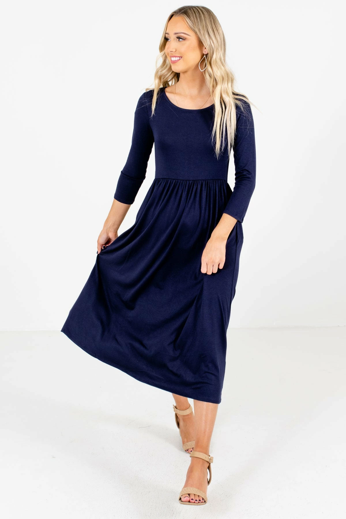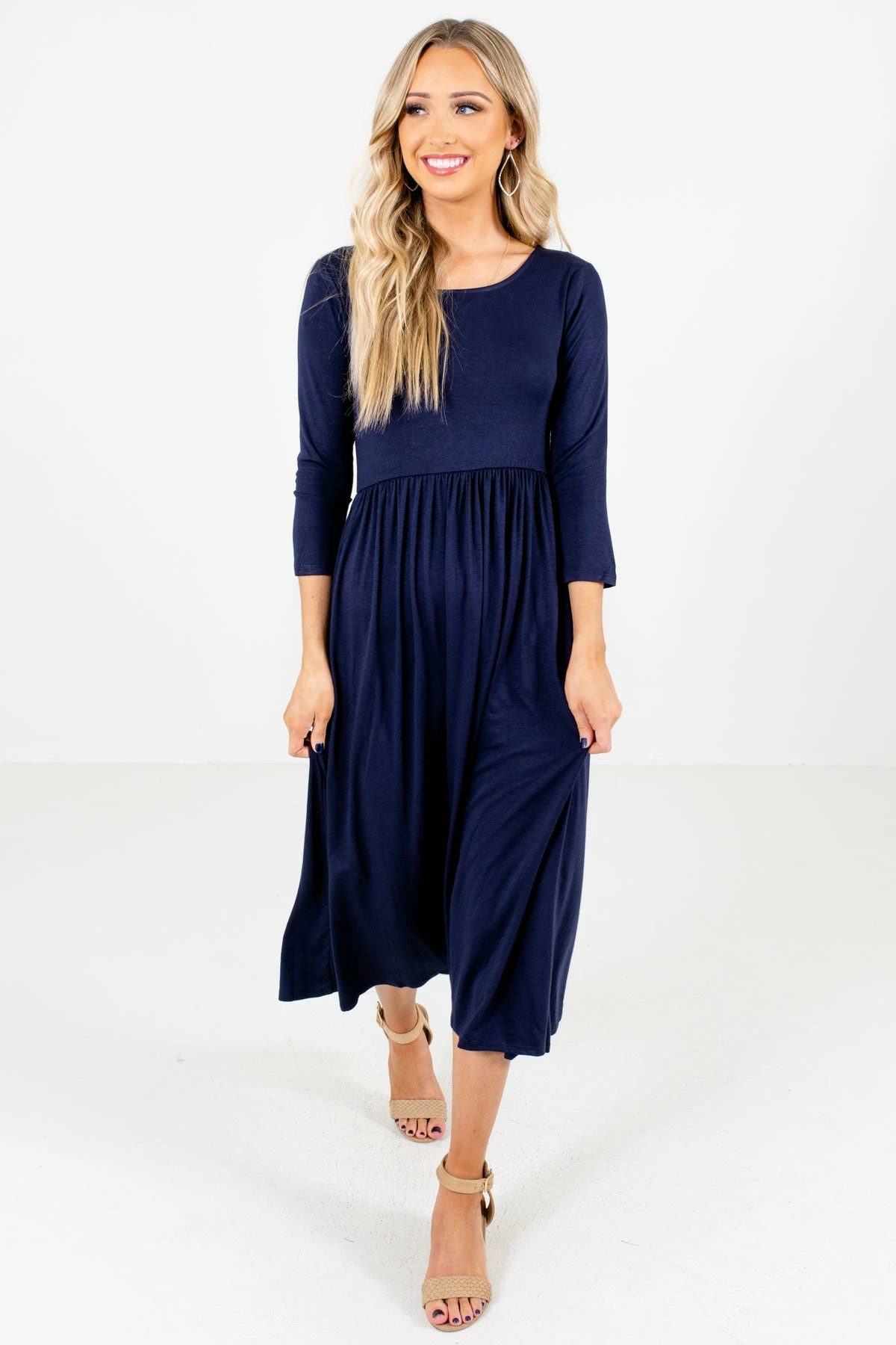 Our new Matters of the Heart Navy Midi Dress is the perfect choice for any occasion! This midi length dress is a solid navy blue color. It features a round neckline, 3/4 length sleeves, and pleated accents! We’re in love with the high-quality material that’s perfect for the upcoming season. The pockets add the perfect finishing touch! Pair our Matters of the Heart Navy Midi Dress with your favorite heels!