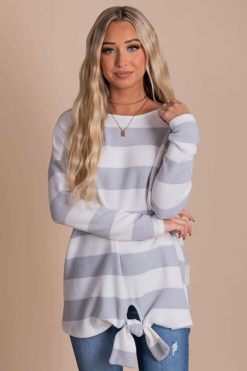 We’re completely obsessed with our Oh So Sweet Light Gray Striped Top! This cute top features a white and light gray striped pattern. The soft, high-quality material is so warm and cozy! We’re in love with the longer length that’s perfect for wearing with leggings. The tie front detail adds the perfect finishing touch!