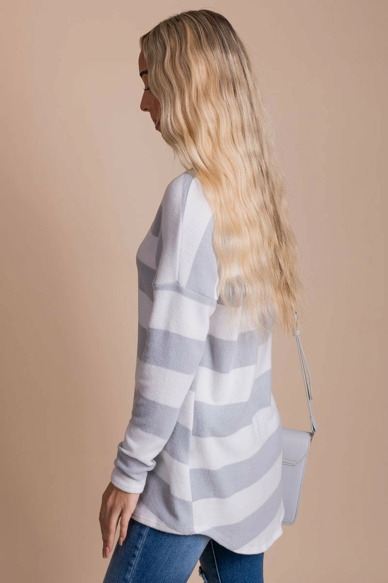 Pair our Oh So Sweet Light Gray Striped Top with leggings and your favorite booties.
