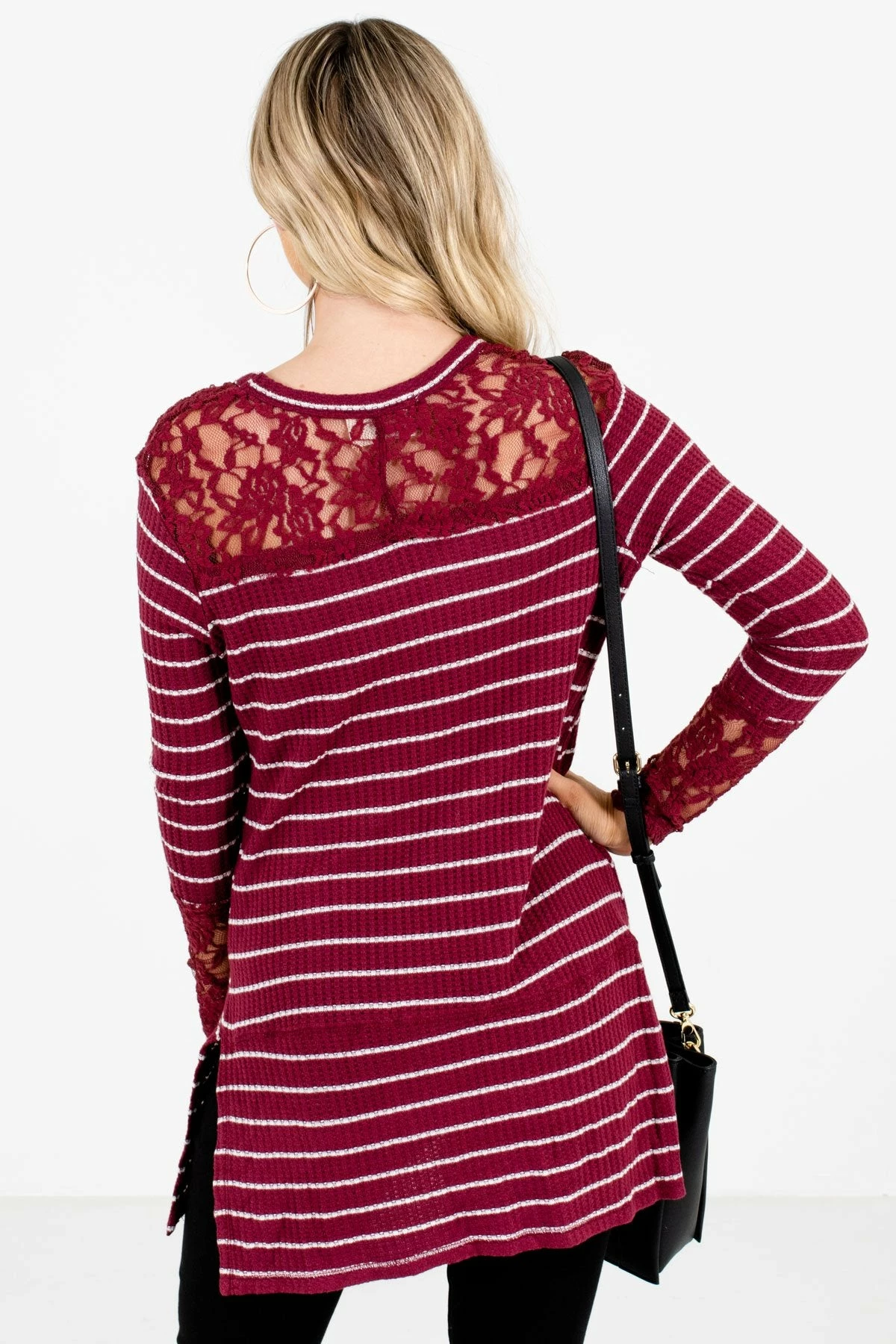 Show your sweet side with our Simply Adorable Burgundy Striped Top! This comfy cute top features a thin white stripe pattern on burgundy, lace yoke and cuffs, and a loose baby doll silhouette. Create an adorable sweet look by pairing the Simply Adorable Burgundy Striped Top with a pair of skinny jeans!Our Simply Adorable Burgundy Striped Top is composed of 90% Nylon 10% Spandex. Hand wash cold. Hang or lay flat to dry. Please do not bleach.