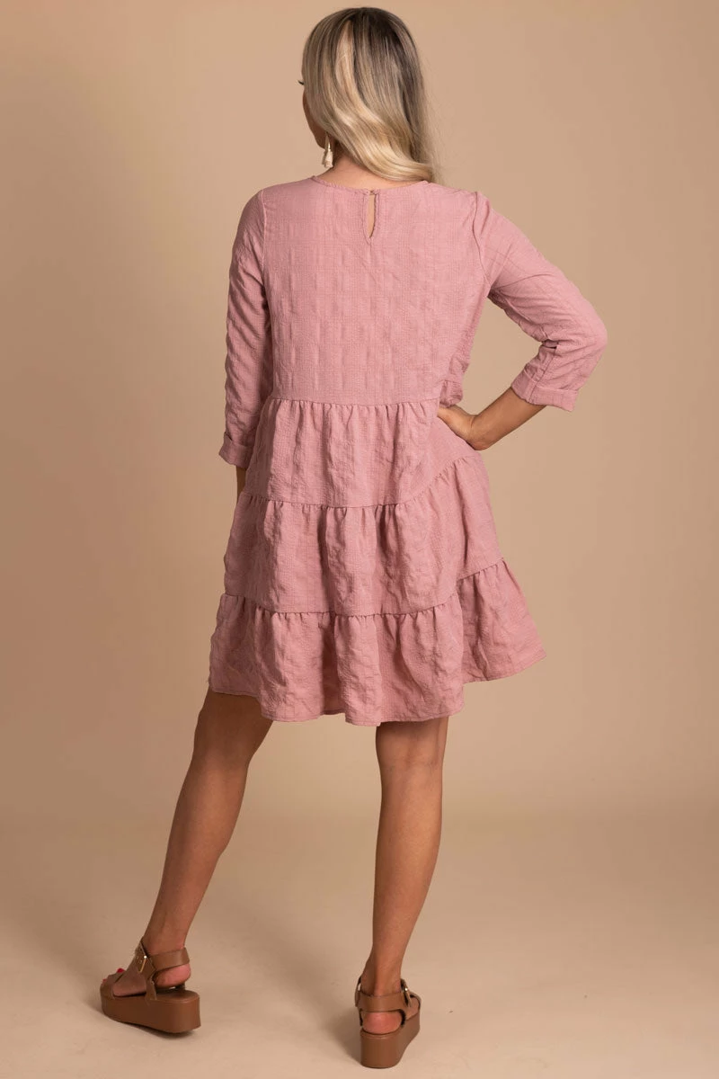 Our Dream Montage Long Sleeve Mini Dress is the perfect dress up or down piece! You’ll love the comfortable knee length, tiered skirt, keyhole back, and textured details! The trapeze style and lightweight material creates a comfortable and flattering silhouette.