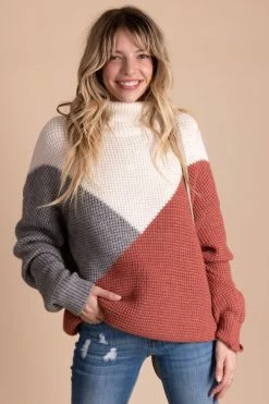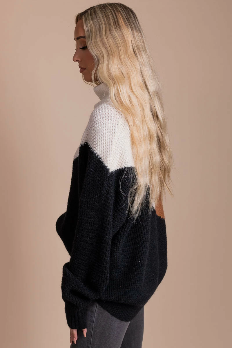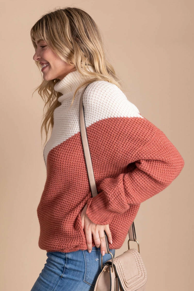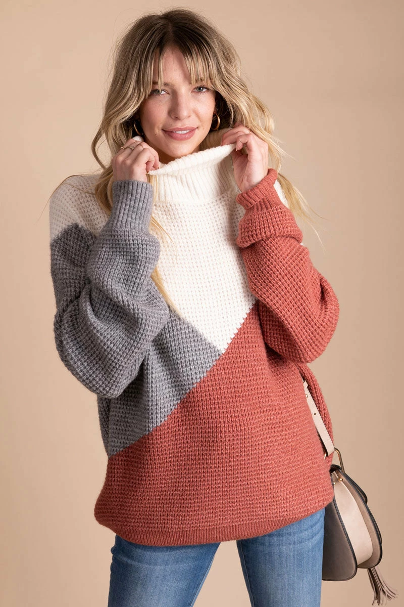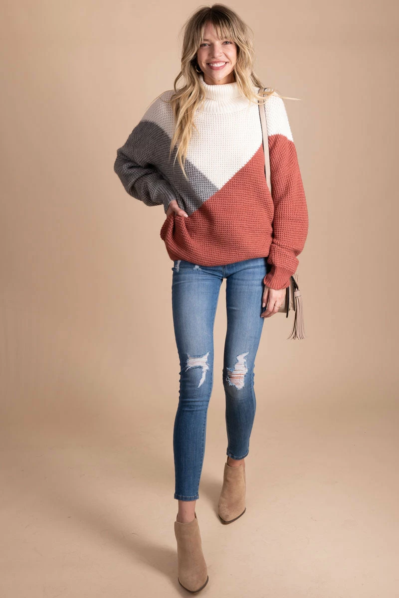 Our Berries and Cream Turtleneck Sweater is a must-have! This sweater features a unique color block design, long sleeves, and a long drapey turtleneck! The chunky style is so trendy and will keep you warm and cozy all season long!