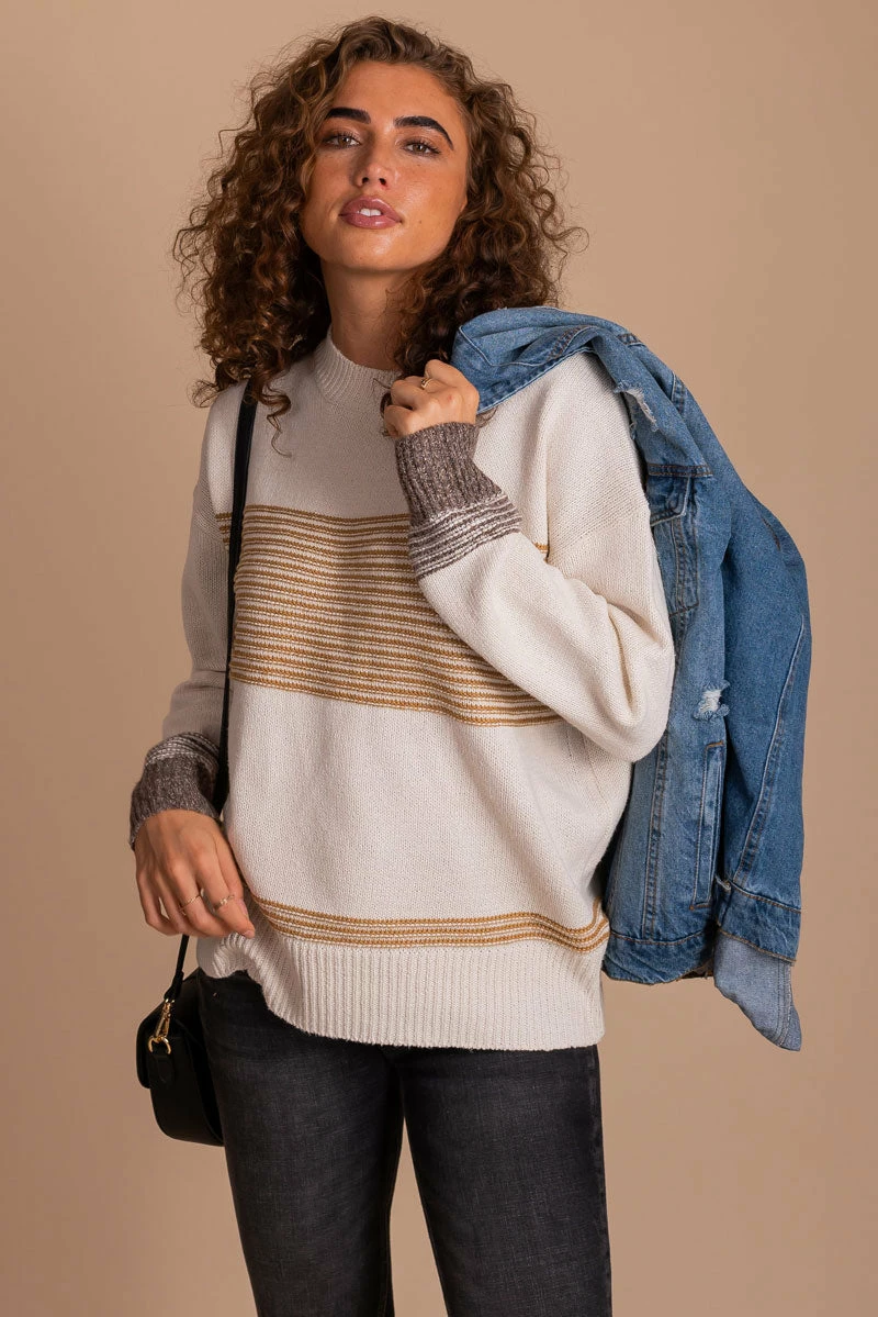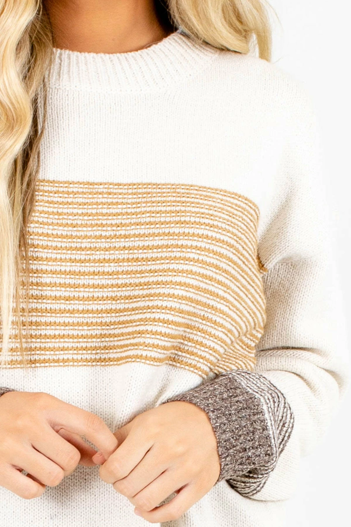 Our new Favorite Record Mustard Striped Sweater is a must-have in every fall wardrobe! This sweater is cream and features a unique mustard yellow and brown striped pattern. We’re in love with long sleeves and round neckline! The high-quality, knit material is so cozy and warm. Pair our Favorite Record Mustard Striped Sweater with your favorite skinny jeans and booties to recreate our model’s cute outfit!