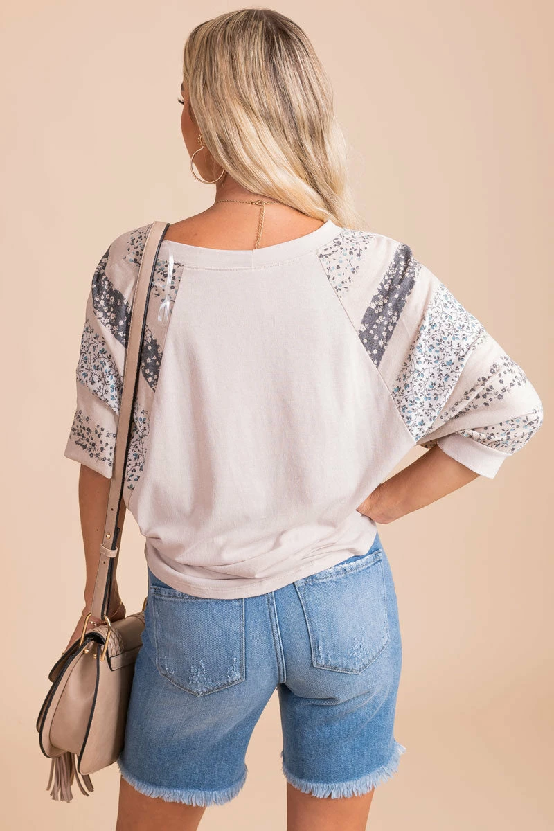 Our Infinite Love Floral Sleeve Top is the perfect everyday top! This piece is a solid light brown color with gray, blue, and white floral accents on the sleeves. It features a round neckline, 3/4 sleeves, and long length! Pair our Infinite Love Floral Sleeve Top with skinny jeans and sneakers to create a cute everyday outfit!