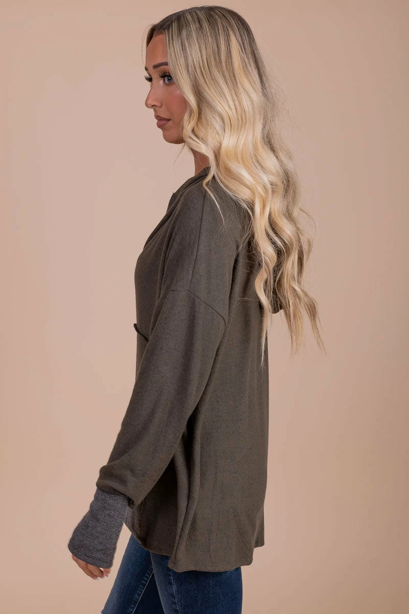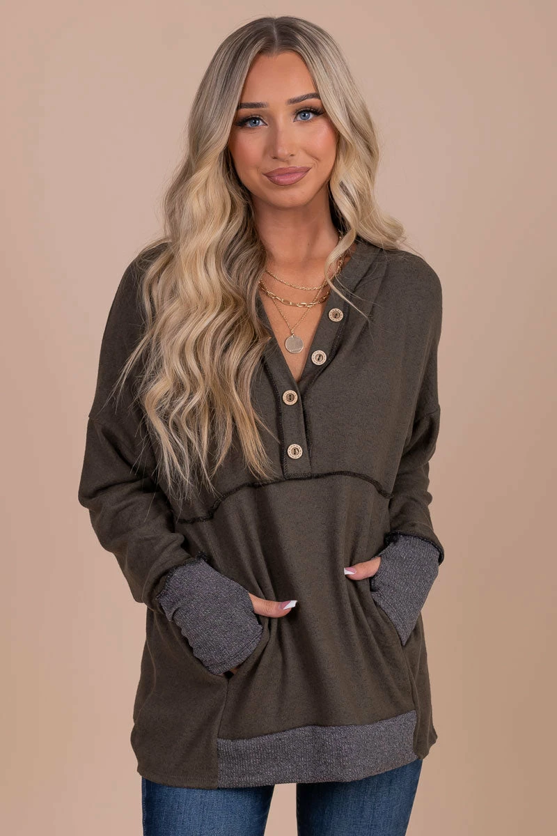 Our Nature Walk Hooded Top is so perfect for the upcoming chilly weather! The long sleeves, functional front pocket, and hood all work together to make this top so cozy! The dark olive green color and non-functional button details add the cutest finishing touch. Pair your Nature Walk Hooded Top with your favorite jeans and booties to create the cutest outfit! Add a vest overtop to transition into winter!