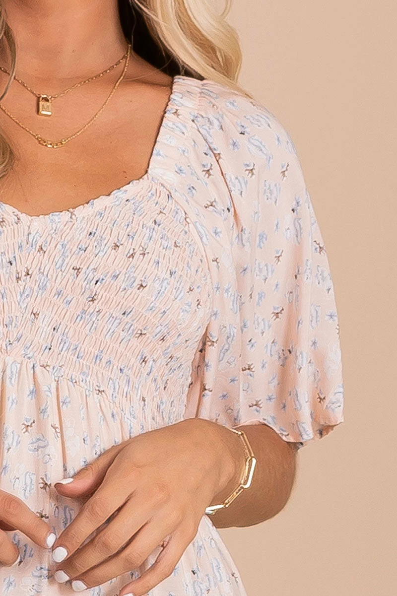 Our Flower Fields Smocked Maxi Dress is so unique! You’ll absolutely love the flowy flutter sleeves, high-quality baby pink color, and floral pattern! The lightweight, high-quality material creates a comfortable and flattering silhouette, and the lace details add the perfect finishing touch!