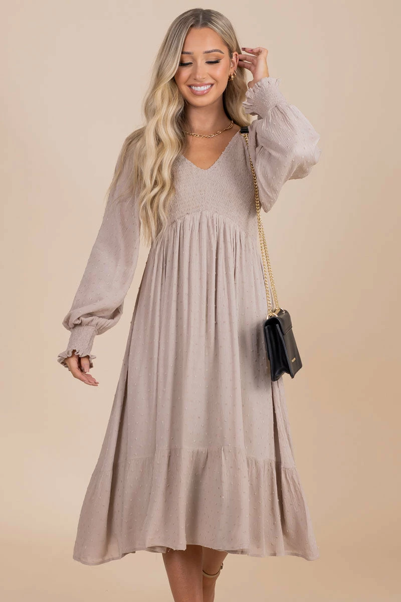 - Pair your No Place Like You Smocked Long Sleeve Midi Dress with your favorite heels or booties to create a cute fall outfit!