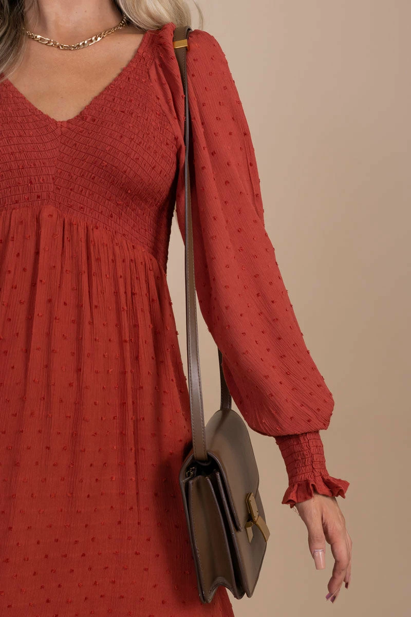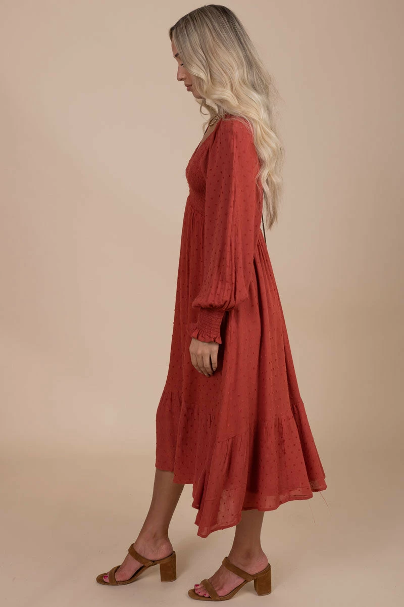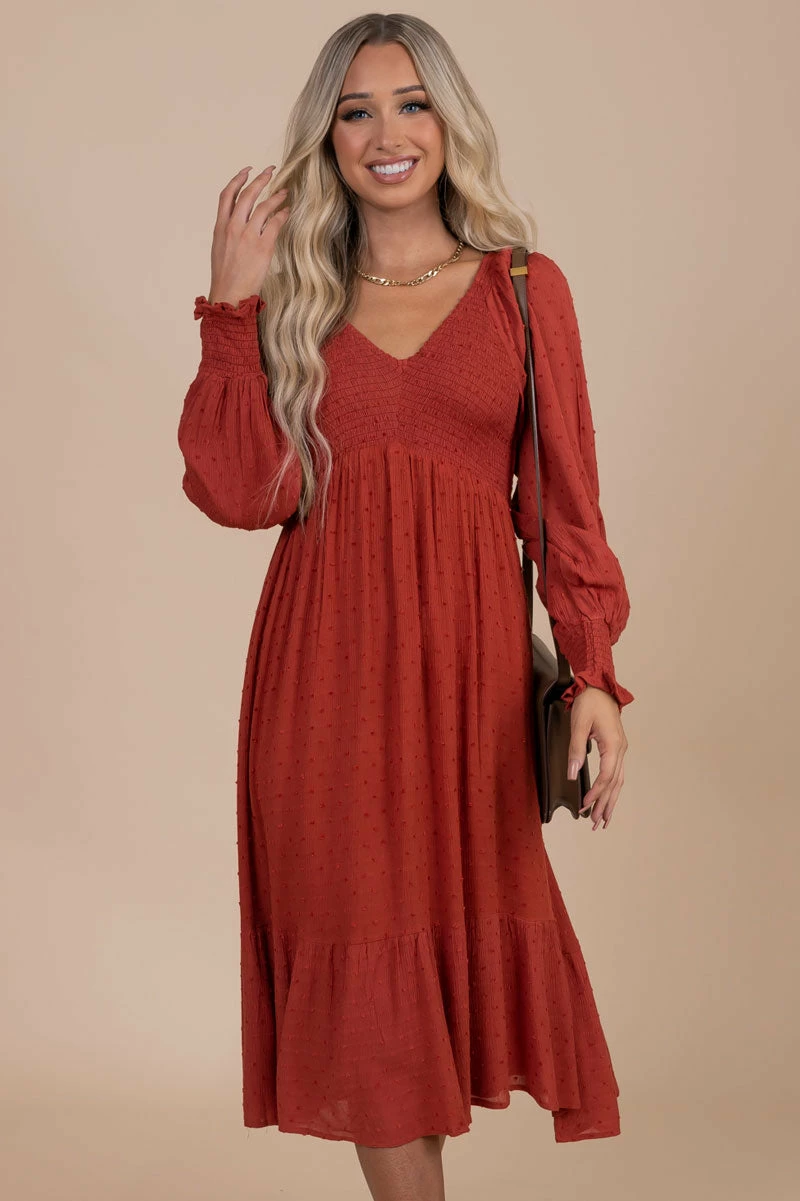 - Our No Place Like You Smocked Long Sleeve Midi Dress would be perfect for a fall wedding guest dress, date night dress, or any special occasion!