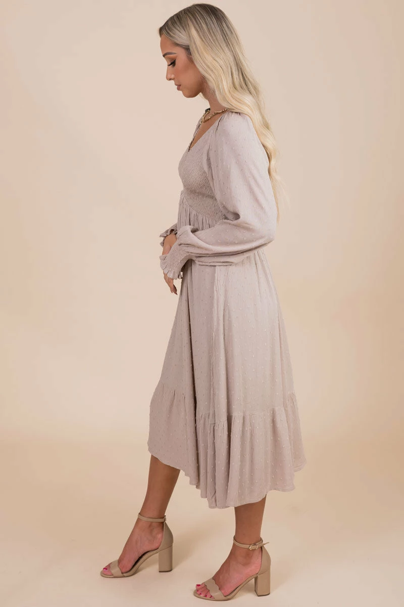 Our new No Place Like You Smocked Long Sleeve Midi Dress is a must-have piece! This dress features long sleeves, a midi length, and tiered details on the skirt! The smocked bodice and textured dot details make this dress so cute and comfortable to wear!