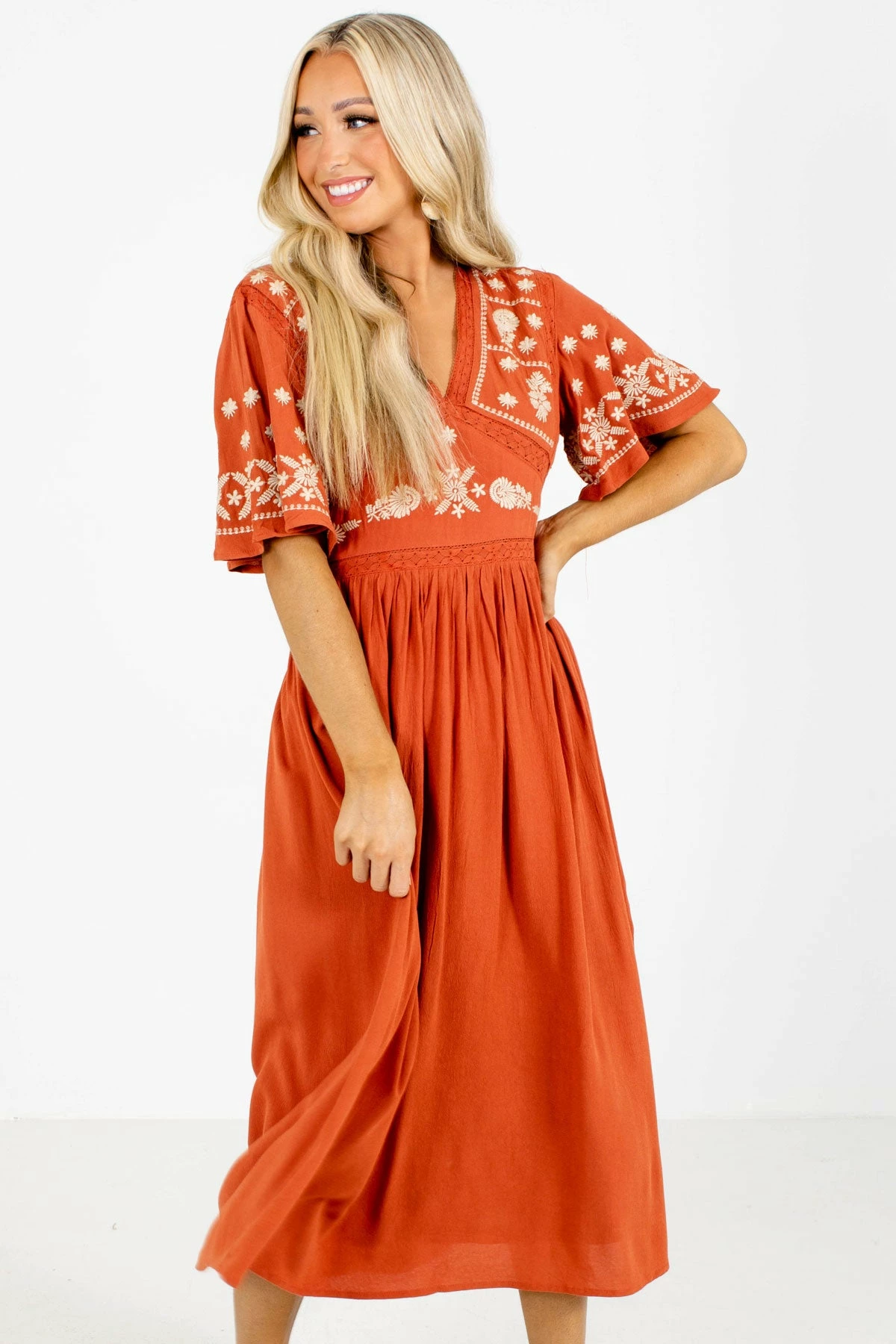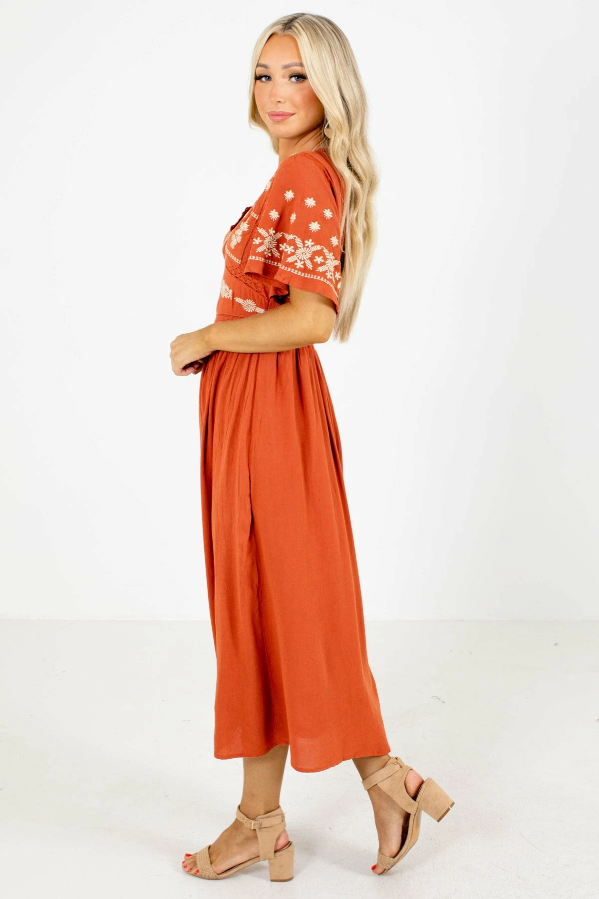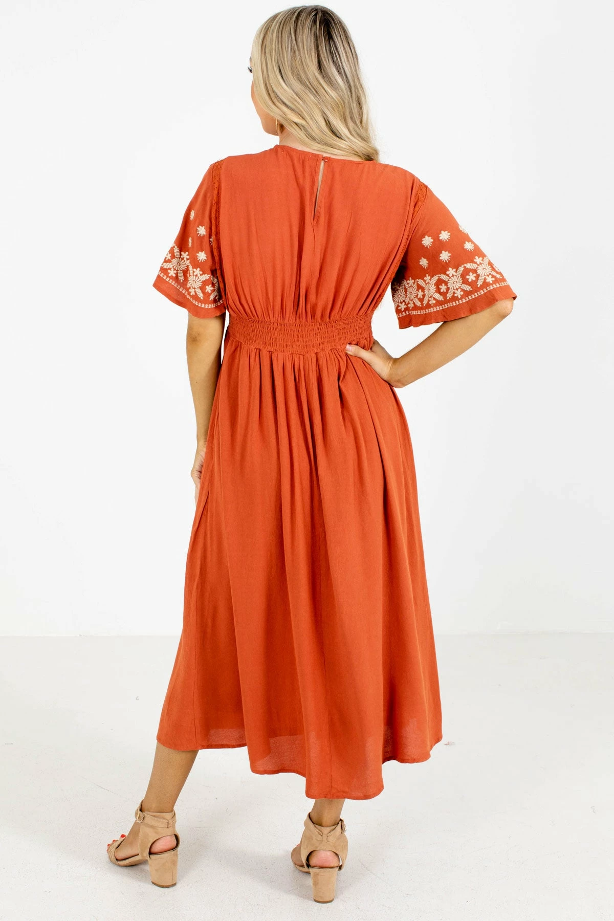 You’ll look and feel ready for fall in our new When Morning Comes Orange Midi Dress! This adorable dress features beautiful rust orange color. We’re in love with the beige floral embroidery throughout the bodice! The v-neckline, keyhole back, and interior lining add the perfect finishing touches. Pair our When Morning Comes Orange Midi Dress with your favorite heels!