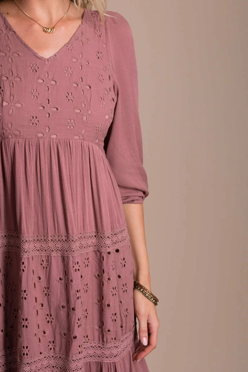 Our Make It Count Eyelet Detail Maxi Dress is so boho! It features eyelet lace detailing throughout, an open back, elbow-length sleeves, and a flounce hem! The back has a functional button closure. It comes in three colors: dusty pink, misty blue, and natural off-white. Pair our Make It Count Eyelet Detail Maxi Dress with your favorite strappy heels to create a beautiful outfit!