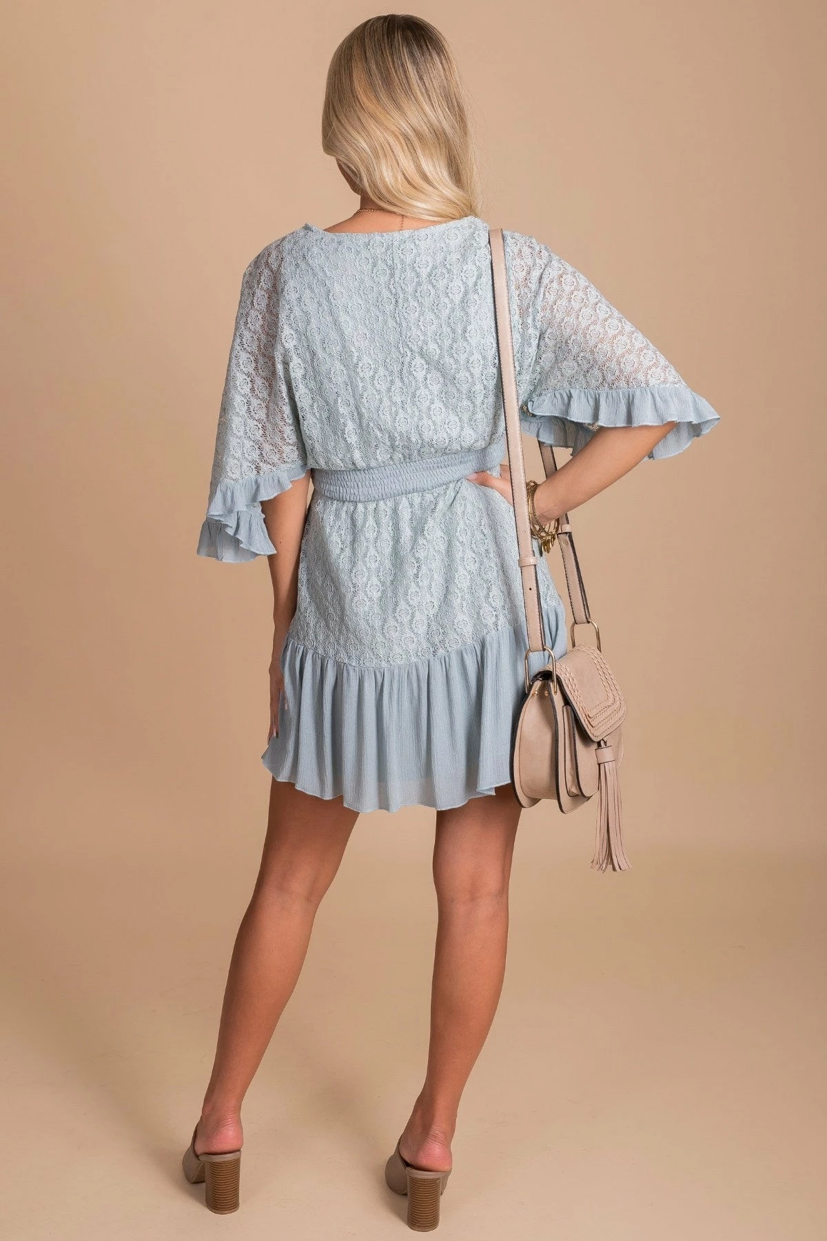 Our Sunny Afternoon Lace Mini Dress is composed of 65% Nylon, 35% Cotton. Hand wash cold. Hang or lay flat to dry. Please do not bleach.
