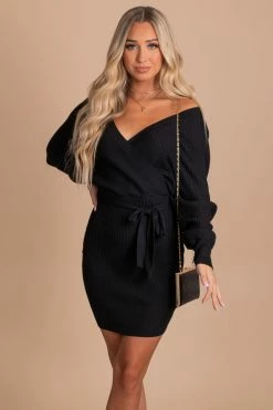 Our Changing Seasons Mini Sweater Dress is a fall must have! This sweater dress features long bubble sleeves, faux wrap style, and belt details! The mini length and warm sweater material make this dress perfect for the upcoming fall season!