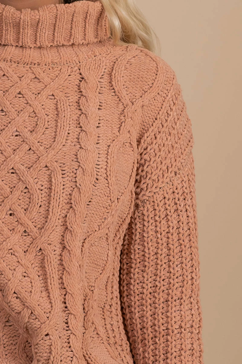 The Take Me Back Turtleneck Sweater is composed of 81% Polyester 19% Acrylic. Hand wash cold. Hang or lay flat to dry. Please do not bleach.