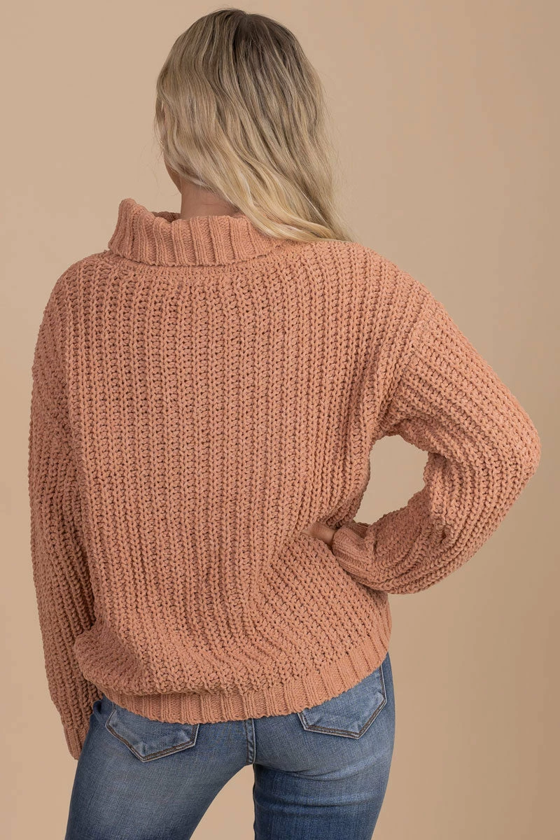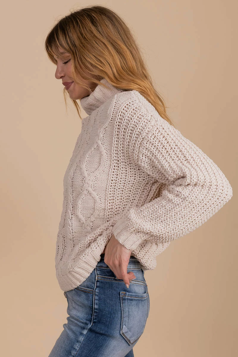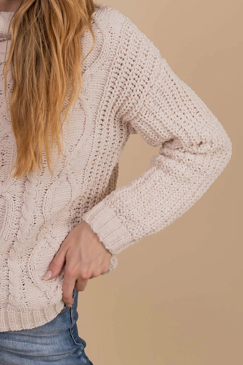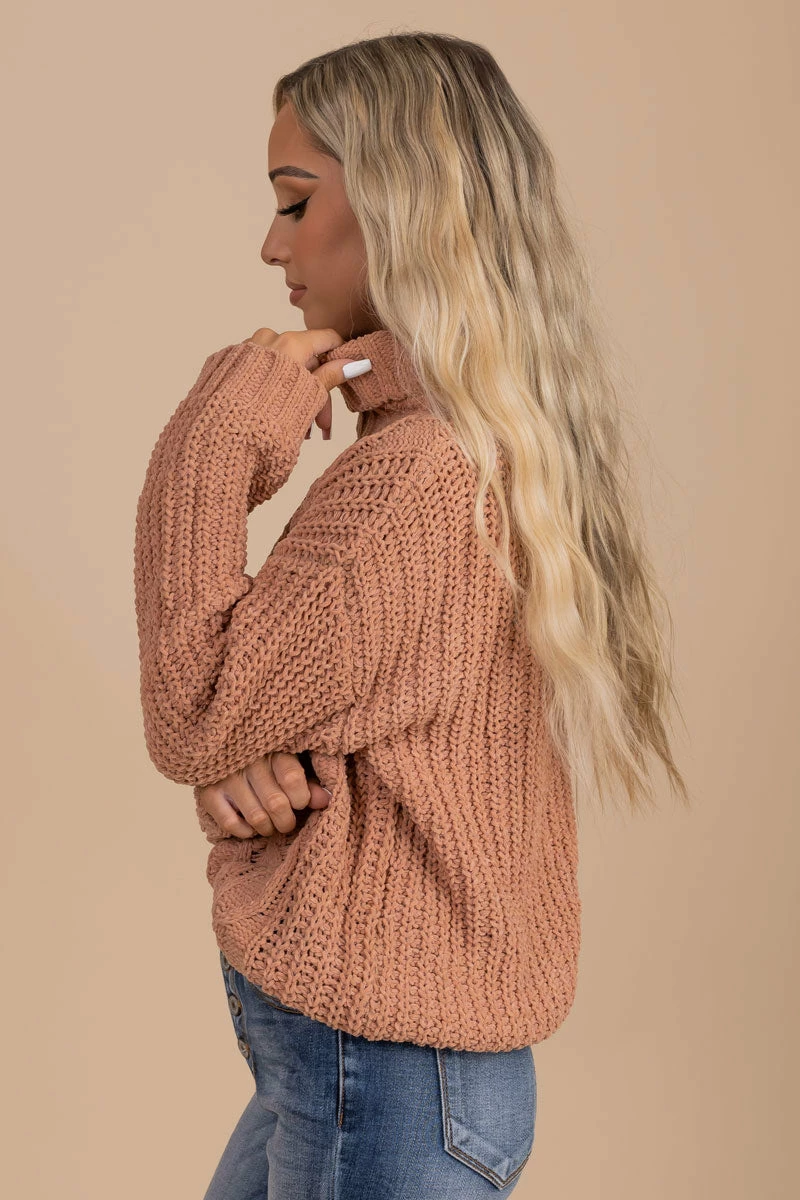 You’ll fall in love with our new Take Me Back Turtleneck Sweater! This sweater features super soft, cable knit material. We’re obsessed with the turtleneck style, long sleeves, and relaxed fit! Pair our Take Me Back Turtleneck Sweater with skinny jeans, a fun belt, and thigh high boots to create a trendy fall look.