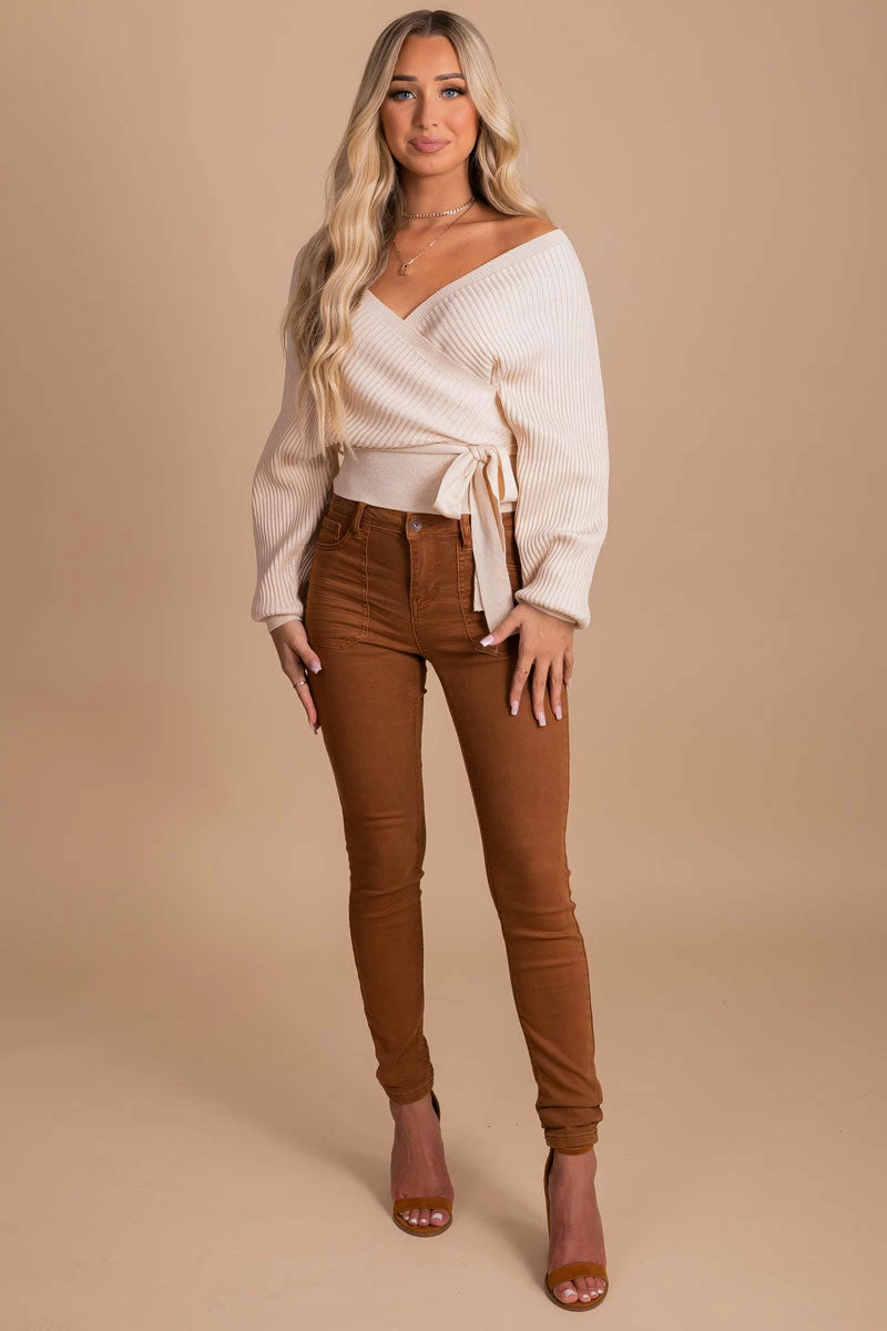 Pair your Warm My Heart Long Sleeve Wrap Sweater with your favorite booties for a cute fall outfit!