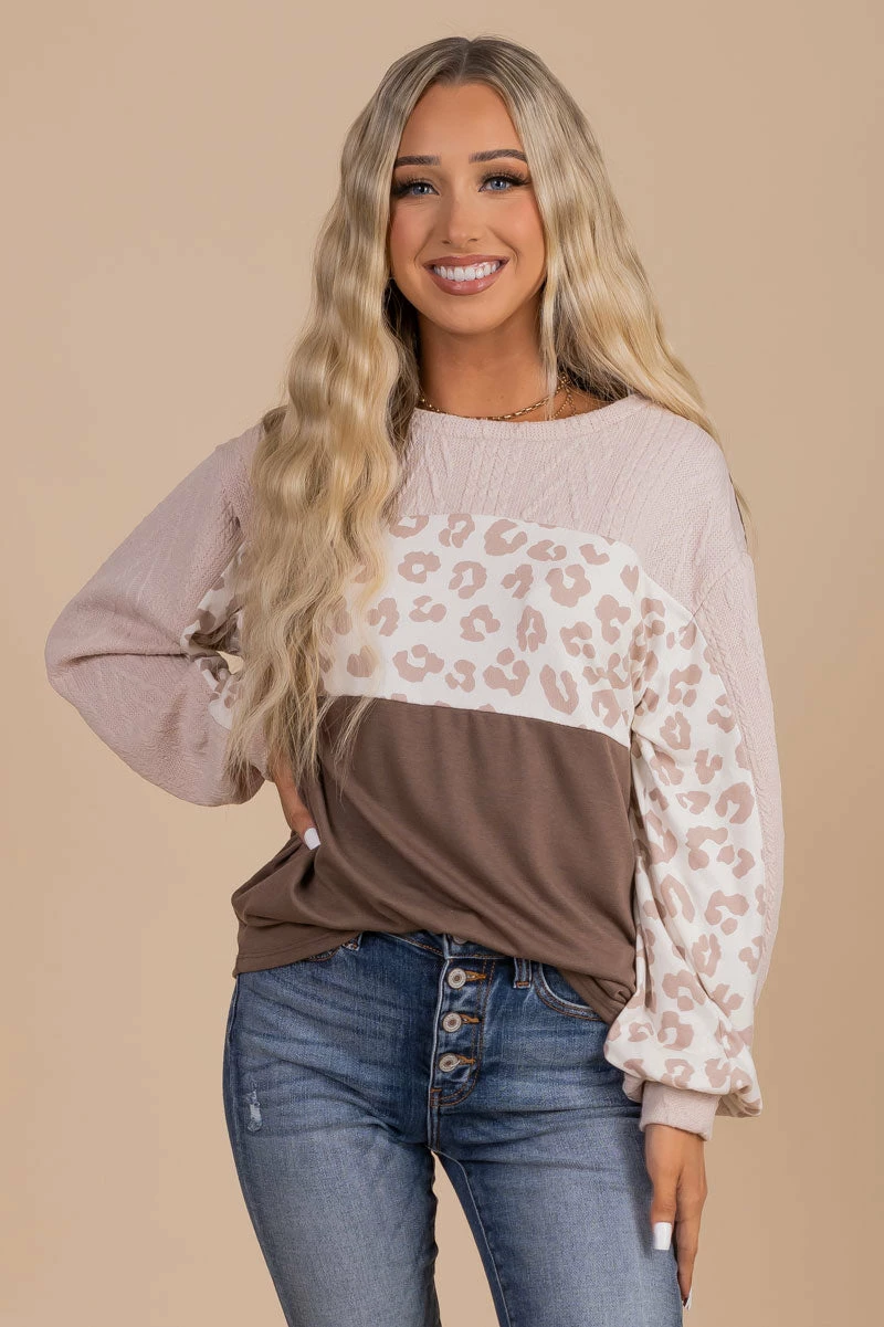 Our Falling Forever Animal Print Sweater is so cute for the upcoming weather! We’re in love with the cute brown, cream, and pink panel design, love sleeves, and of course the animal print details! The long sleeves and cozy sweater material will keep you warm all season long! Pair your Falling Forever Animal Print Sweater under your favorite jacket to create a cute look so stay warm!