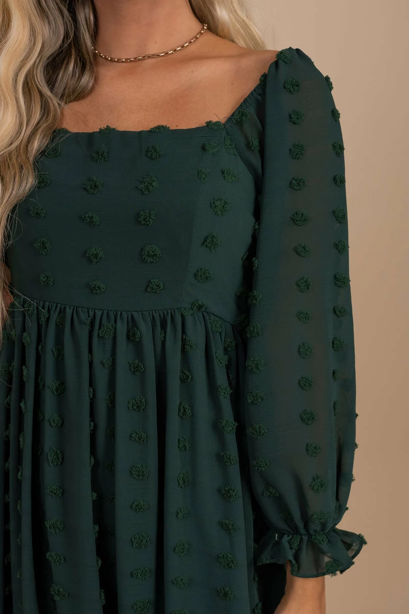 Our new Take Me Away Puff Sleeve Mini Dress is a closet staple! This stunning dress features a mini length with full lining, long puff sleeves, and a square neckline! The dark hunter green color and textured dot details offer such a timeless touch to this unique dress!
