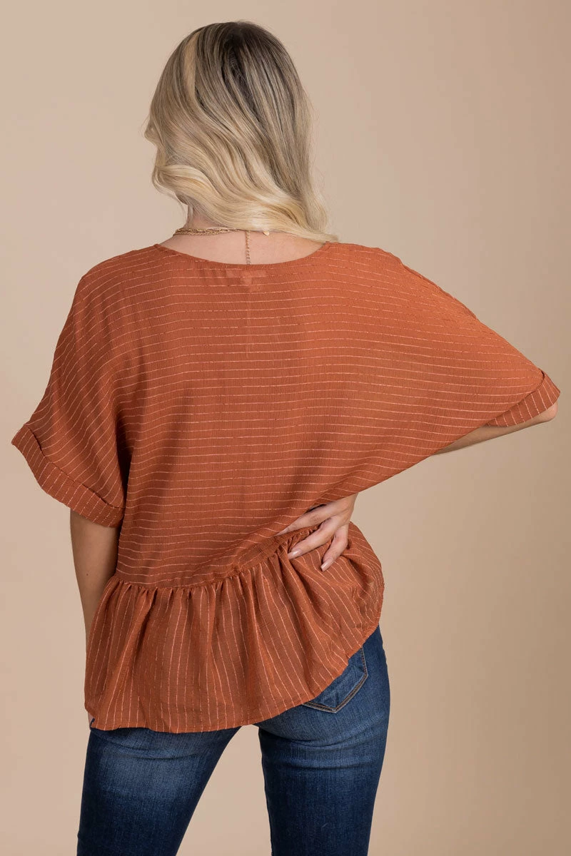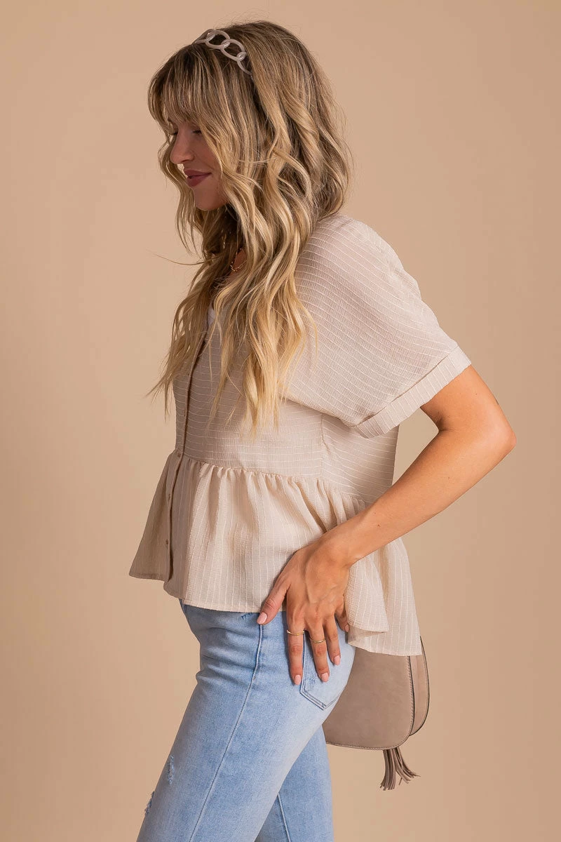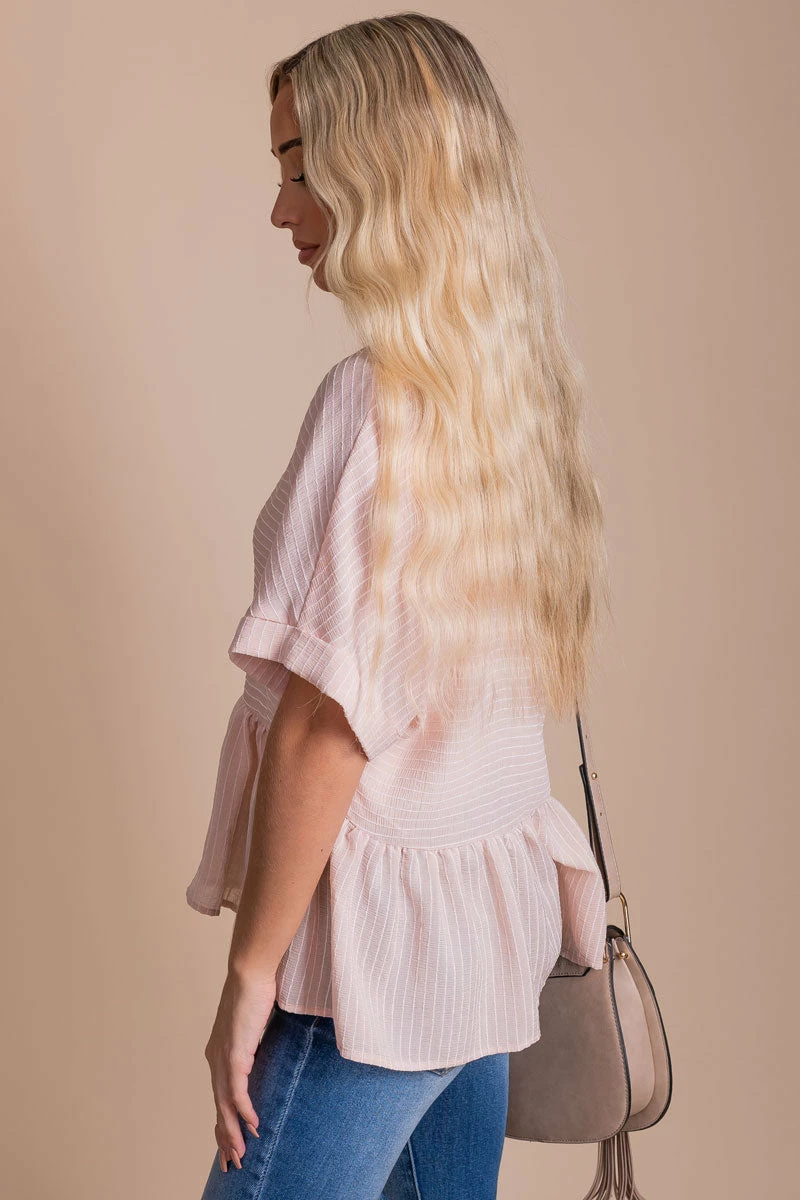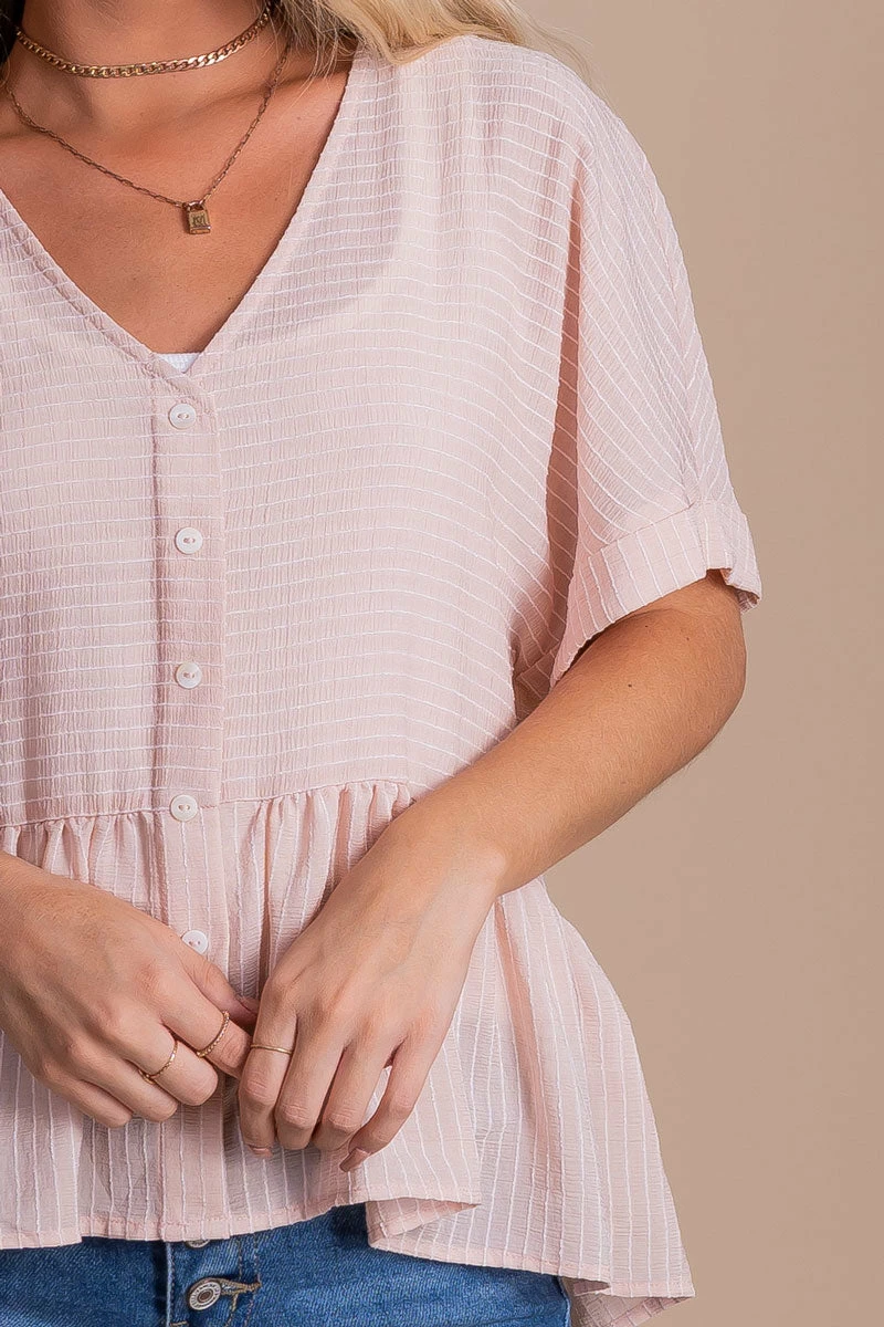 Our Balcony View Peplum Top is an absolute must-have! This cute top features a peplum style hem, v-neckline, and stunning button-front decorative details. We’re in love with the high-quality sheer material that creates a comfortable and relaxed fit! Pair our Balcony View Peplum Top with distressed skinny jeans and sandals for a cute warm-weather outfit!