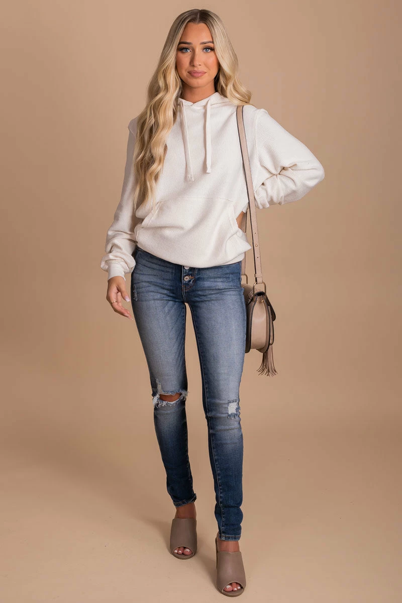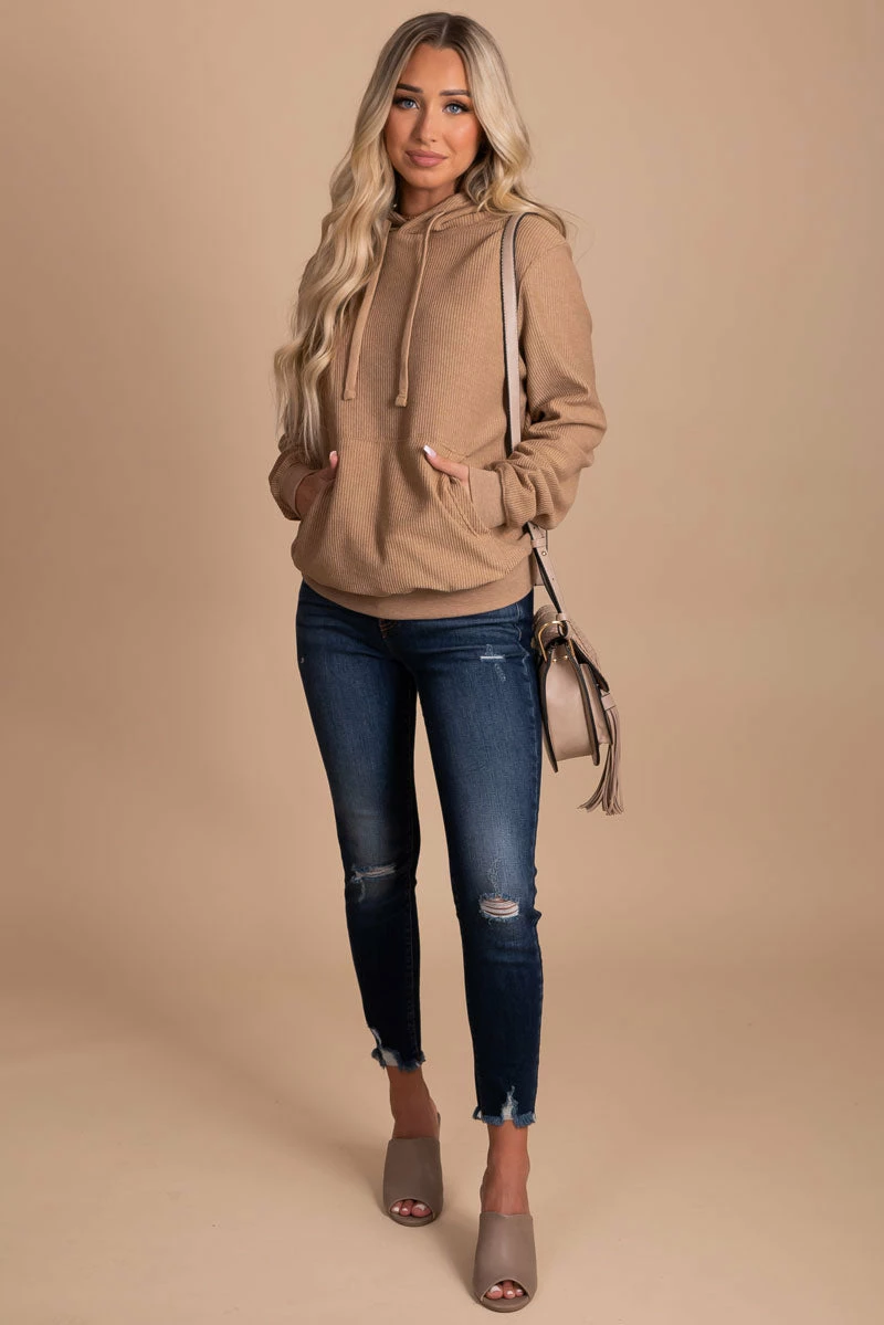 Our Just To See You Ribbed Hoodie will quickly become your new favorite for the transitioning season! The drawstring hood, ribbed material, and front pocket work together to create this trendy piece. It’s available in two color options: ivory off white and taupe brown.