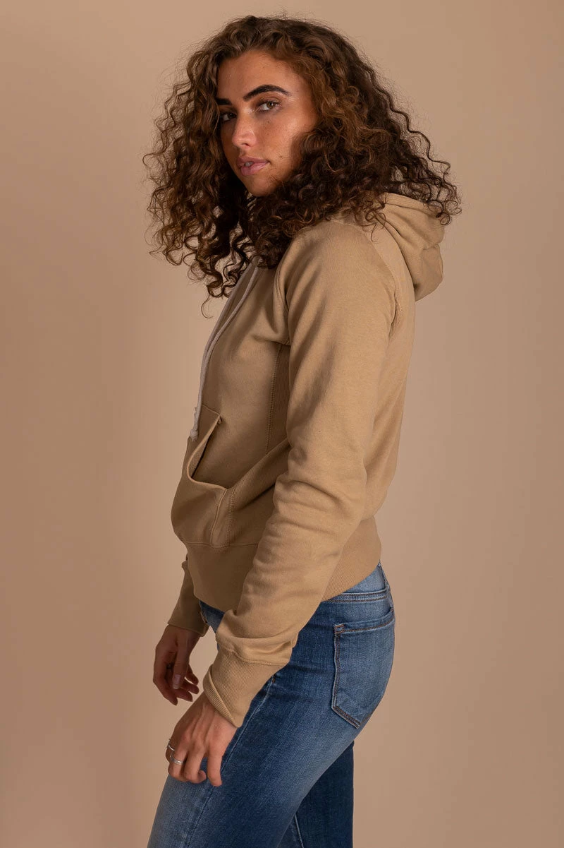 The Schooled You Long Sleeve Hoodie will quickly become your wear-everywhere piece. This neutral hoodie is perfect for layering in the colder months. The trendy taupe brown color, and drawstring hood, and front pockets make it so easy to throw on and go. The soft, high-quality material creates a comfortable and flattering silhouette.