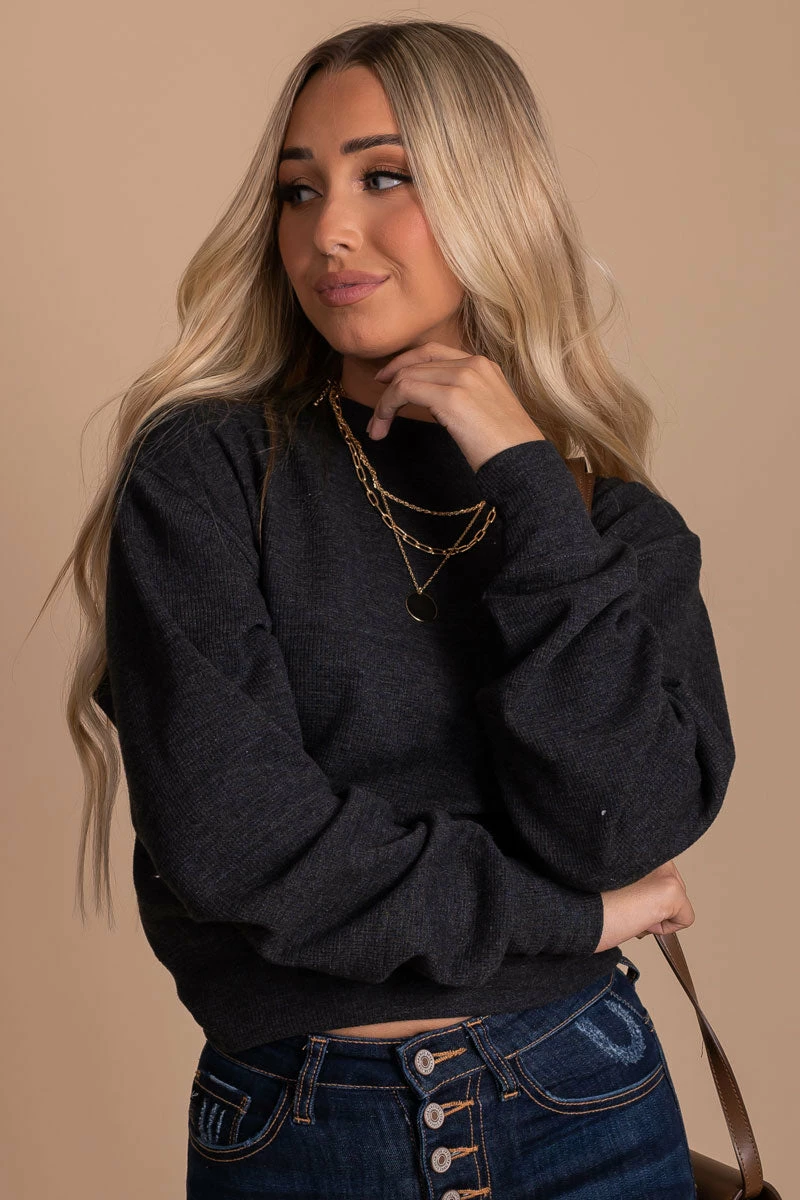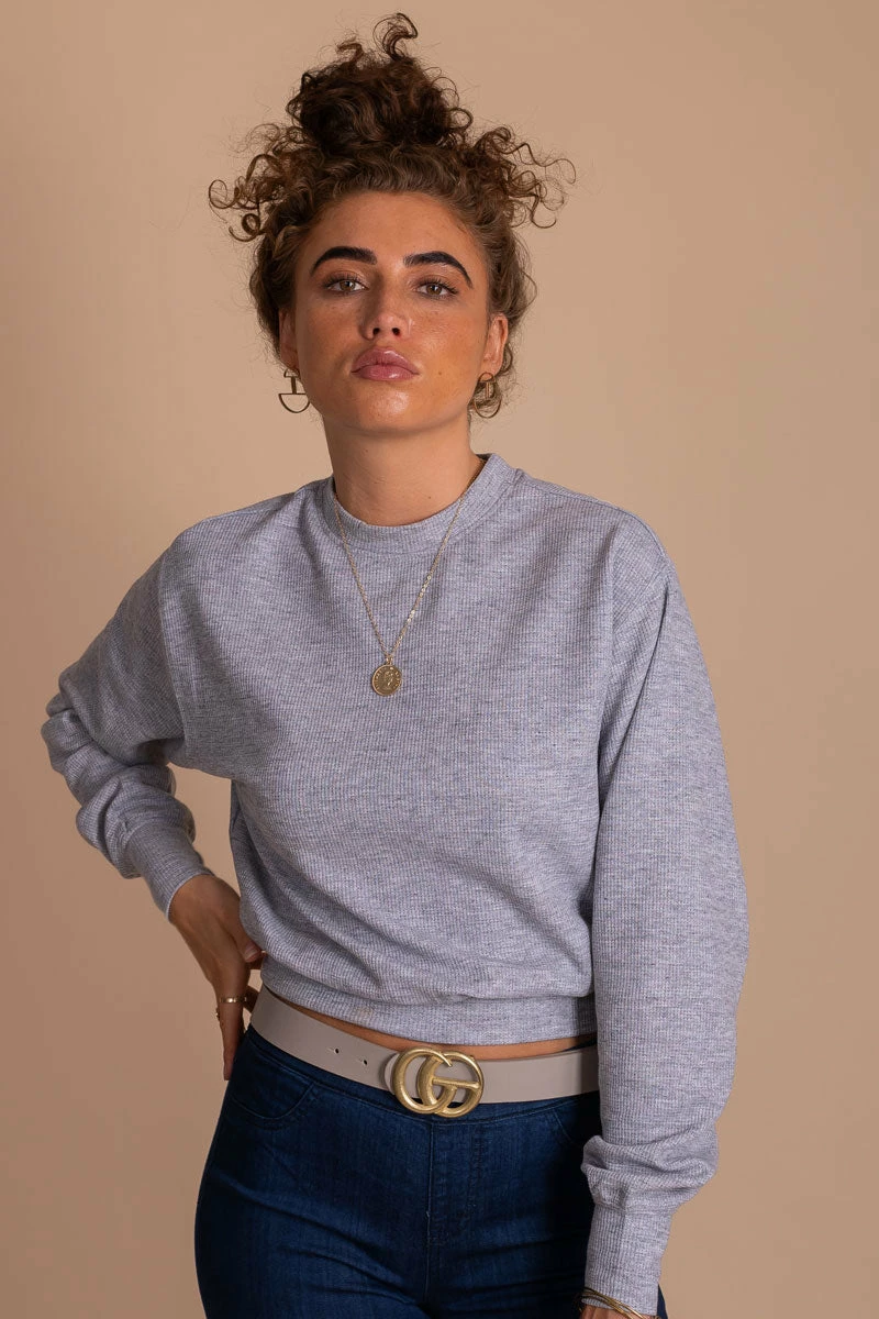 The Simpler Times Long Sleeve Sweater is a winter staple! This sweater features two high-quality color options, a fun textured waffle material, and a cropped length! The cozy brushed fleece and banded cuffs make this sweater so comfy and easy to wear! Pair your Simpler Times Long Sleeve Sweater with your favorite jeans for a cute and trendy fall outfit!