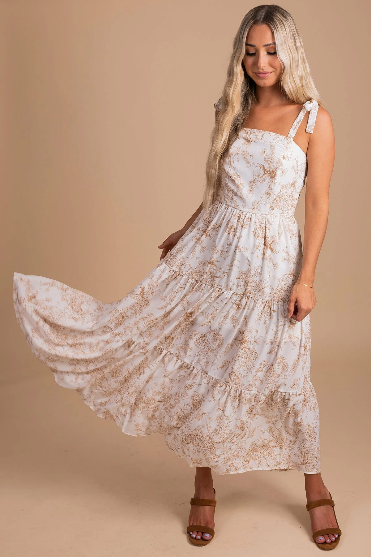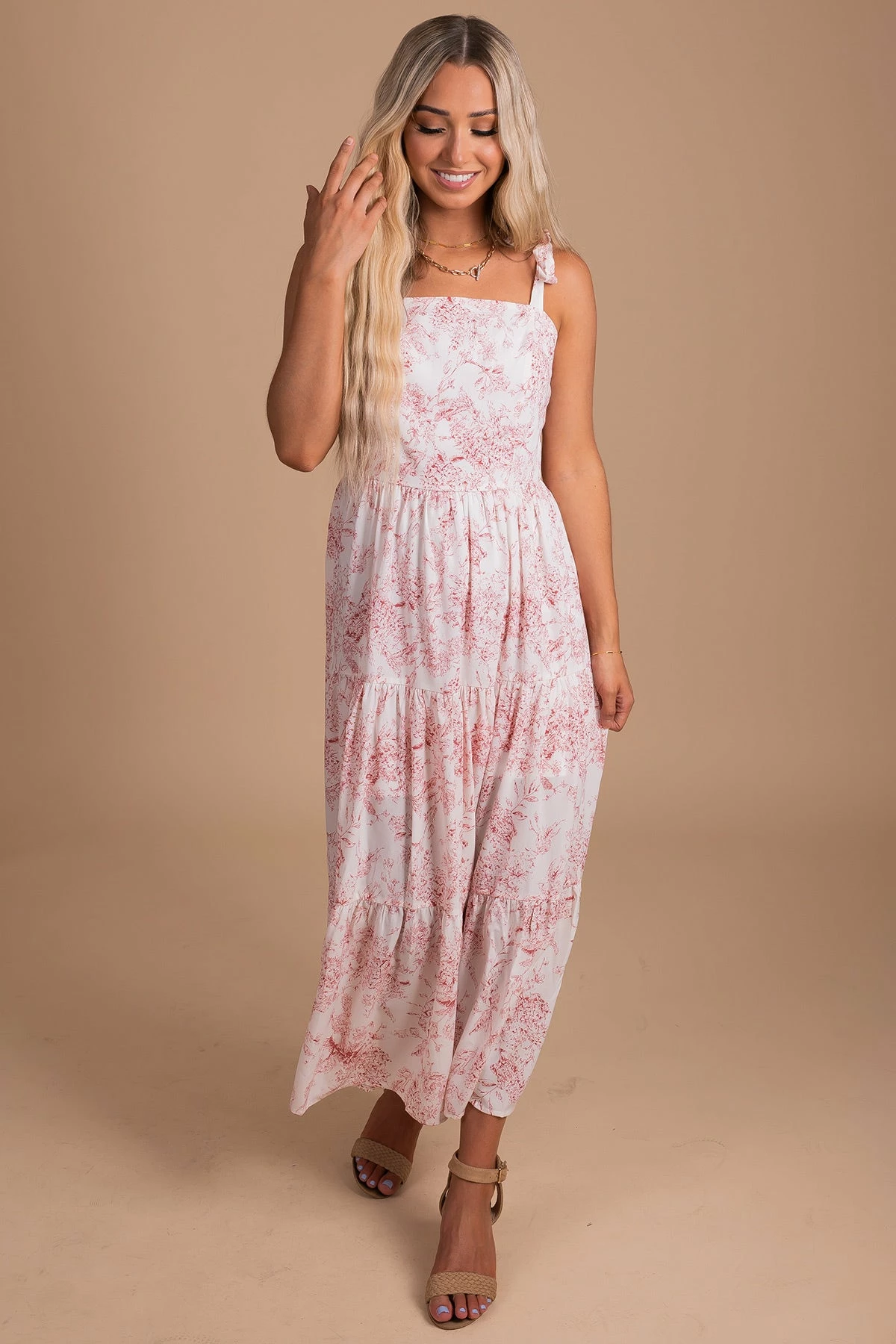 Our Rooftop Gardens Floral Maxi Dress is a summer must-have! This midi dress features a gorgeous floral print material, square neckline, self-tie straps, and a tiered skirt. It has a partial interior lining that reaches mid-thigh for a great amount of coverage. The a-line fit and flowy skirt make this dress so fun and flattering. It comes in off white with gold floral print, and off white with berry red floral print.