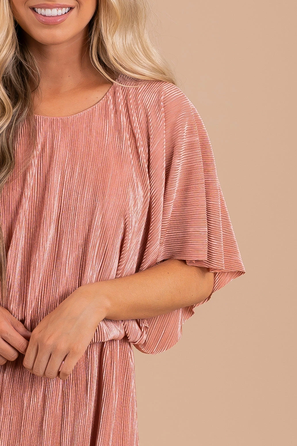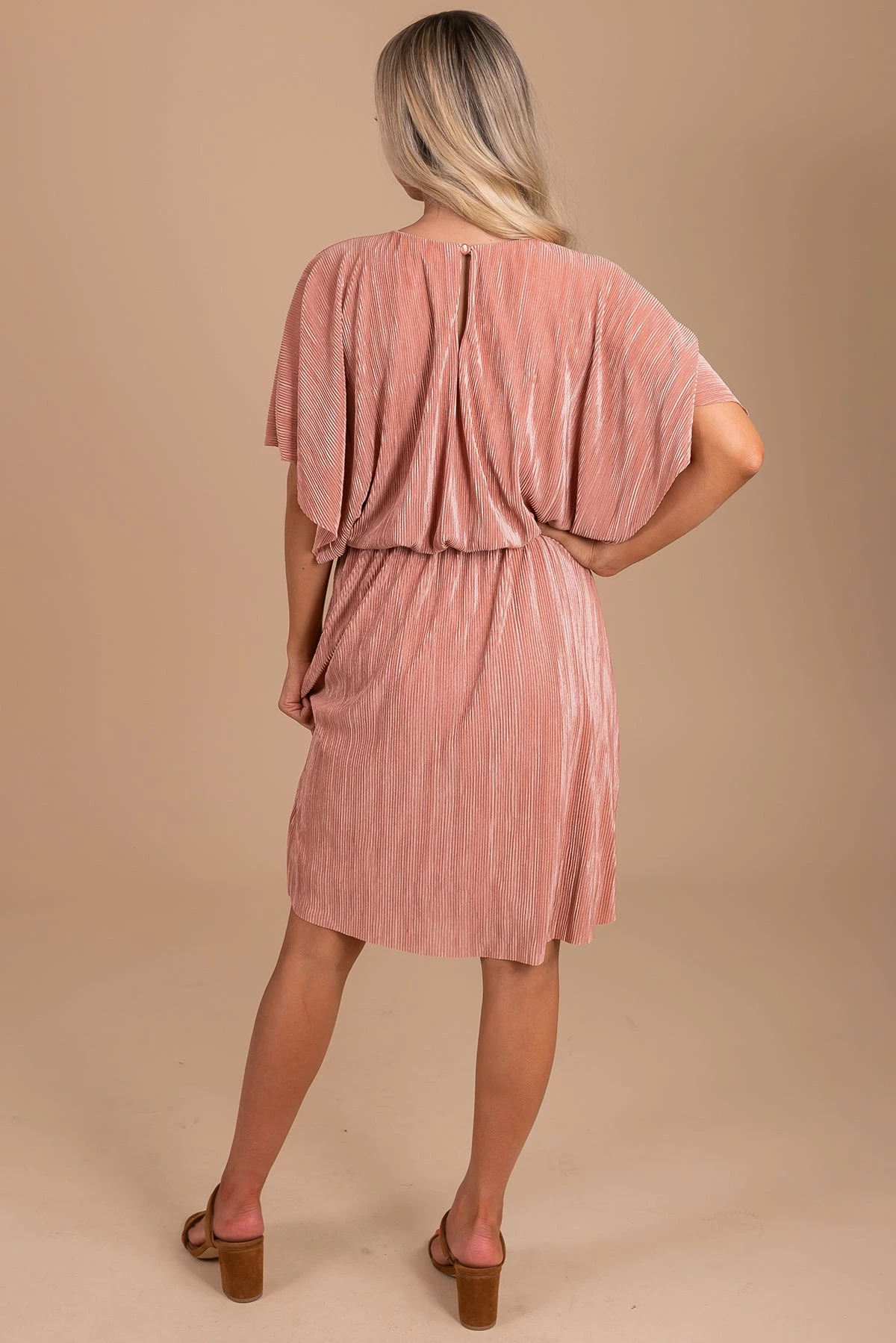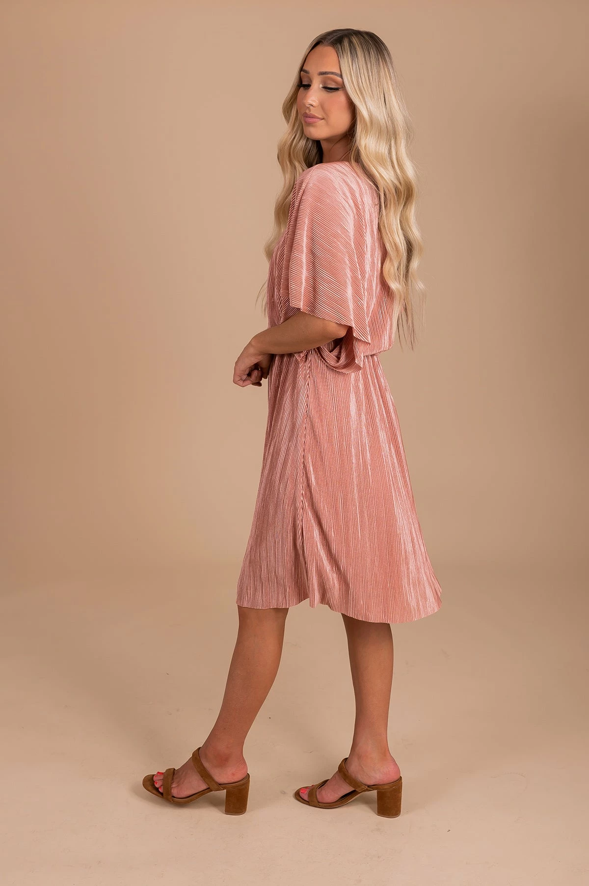 Our In The Limelight Ribbed Knee-Length Dress is one of our favorites! The material is light and flowy, so it’s super easy to wear. It’s also stretchy, making it baby bump-friendly. The round neckline, ribbed detailing, and keyhole back create such a stunning dress for any special night out! The shimmery fabric and side slit in the hemline adds a romantic touch, making this the perfect special occasion dress.