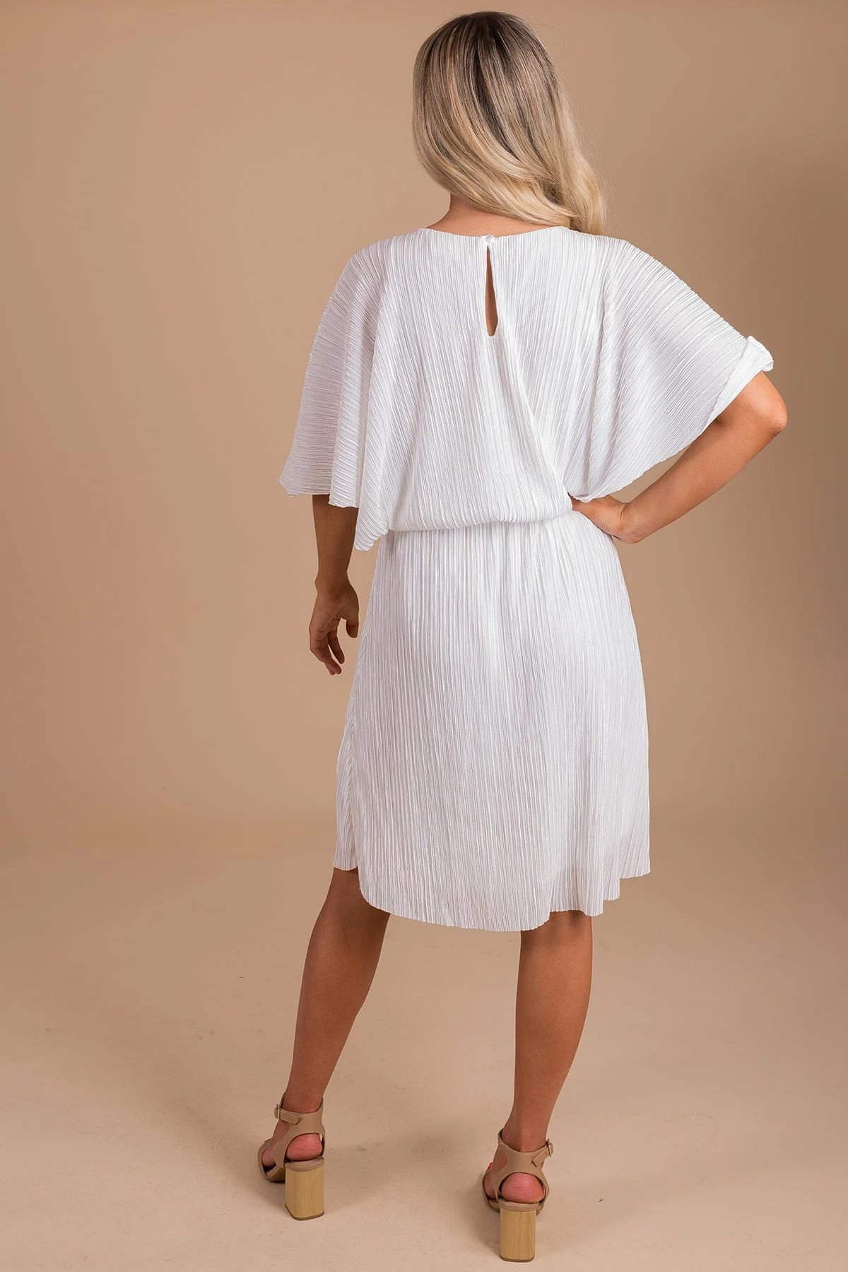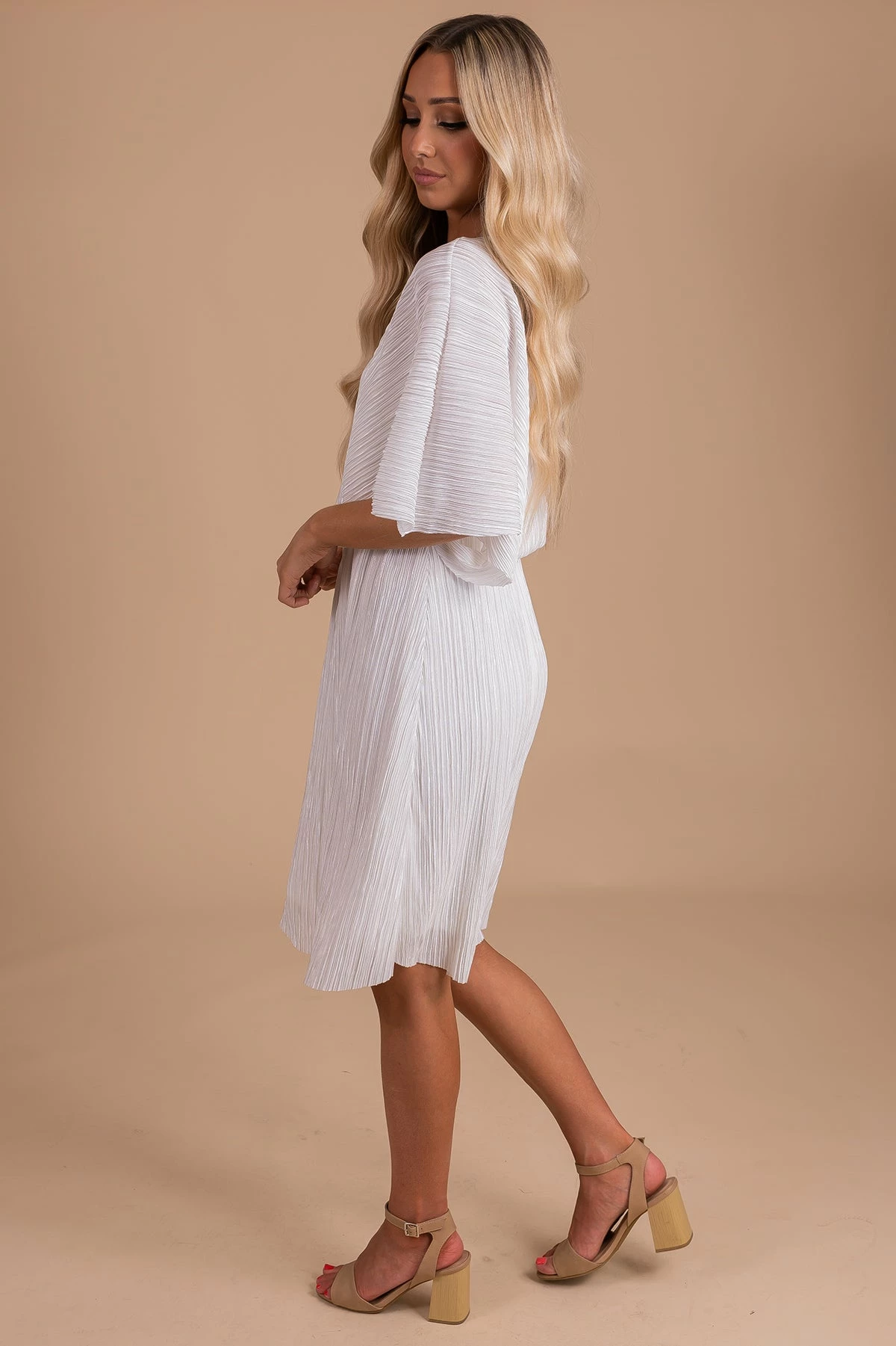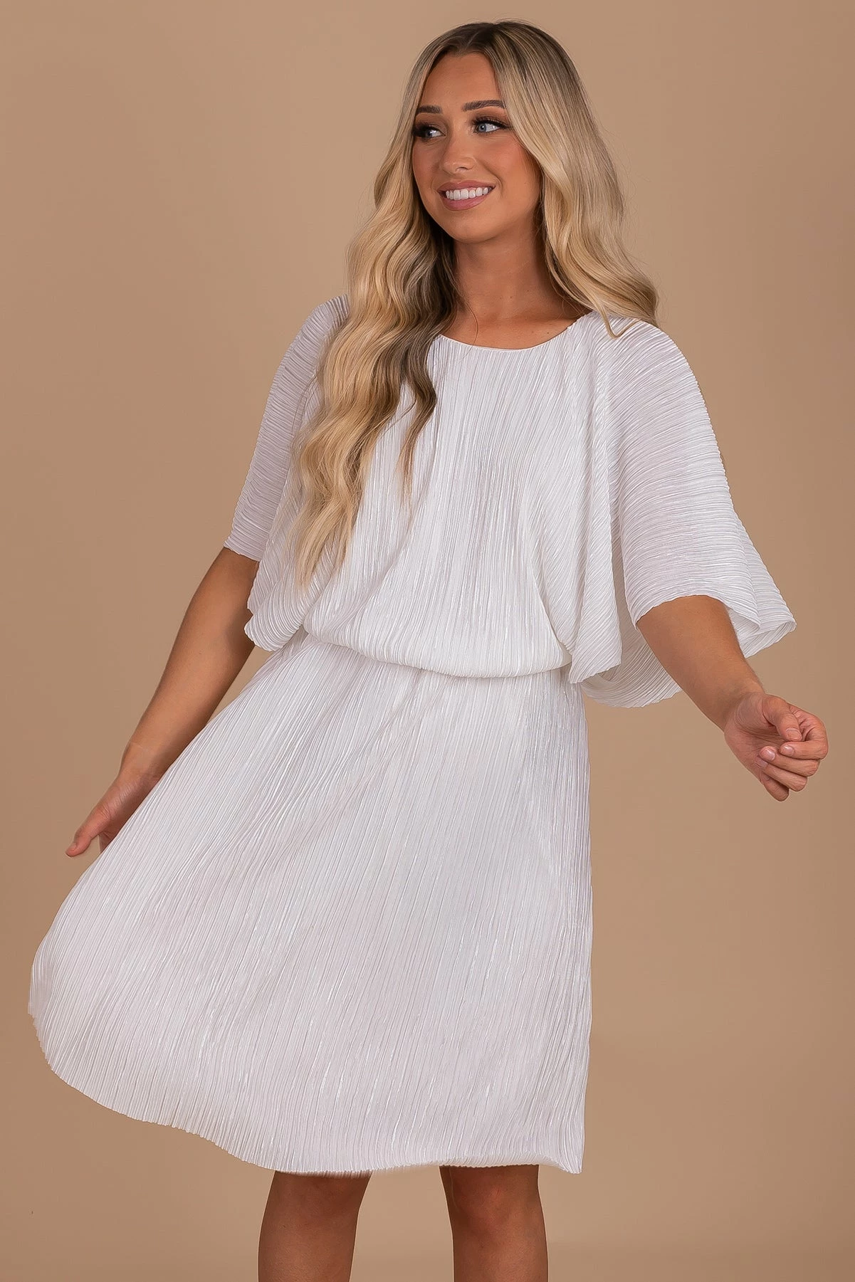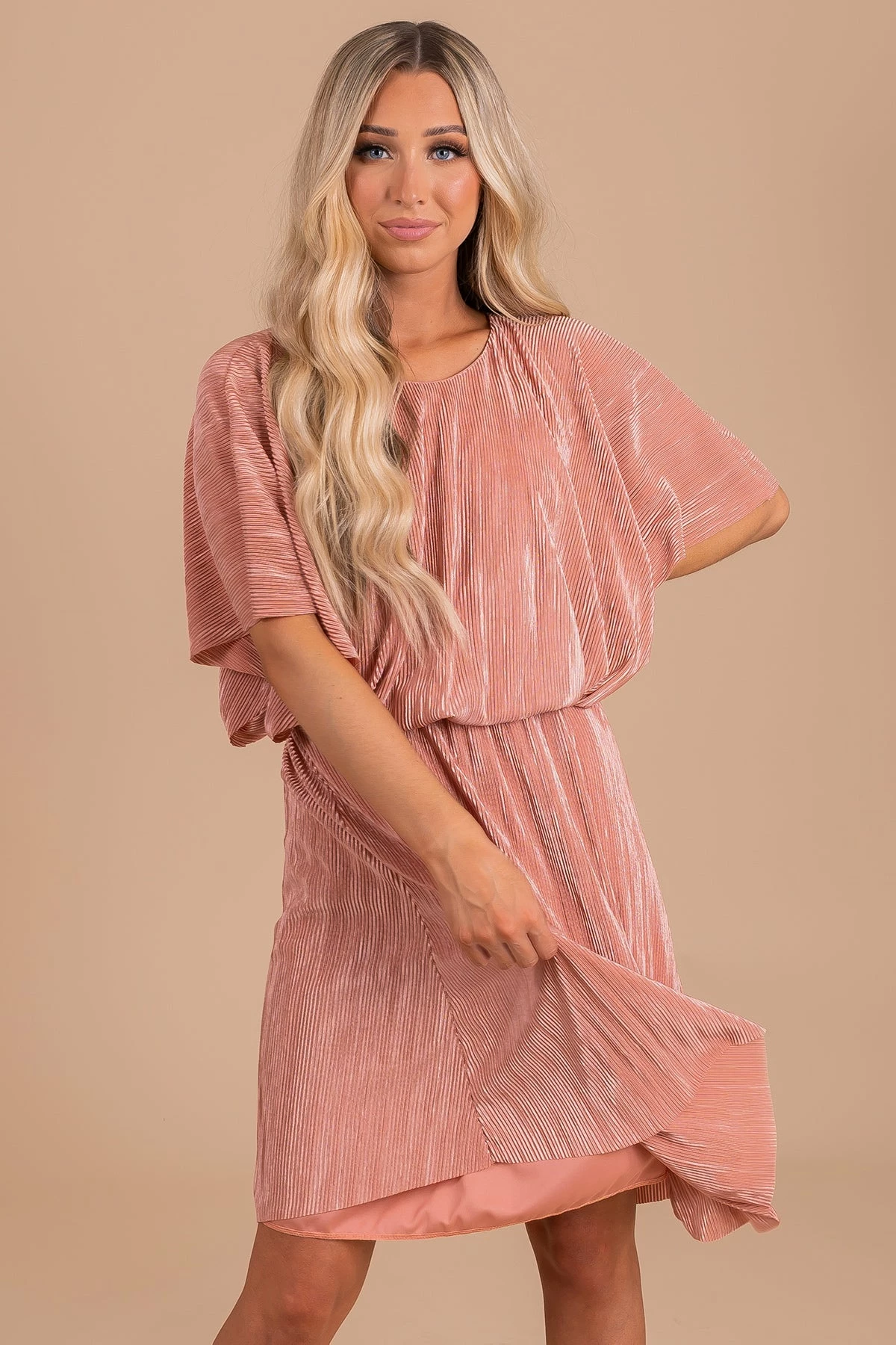 Our In The Limelight Ribbed Knee-Length Dress is one of our favorites! The material is light and flowy, so it’s super easy to wear. It’s also stretchy, making it baby bump-friendly. The round neckline, ribbed detailing, and keyhole back create such a stunning dress for any special night out! The shimmery fabric and side slit in the hemline adds a romantic touch, making this the perfect special occasion dress.