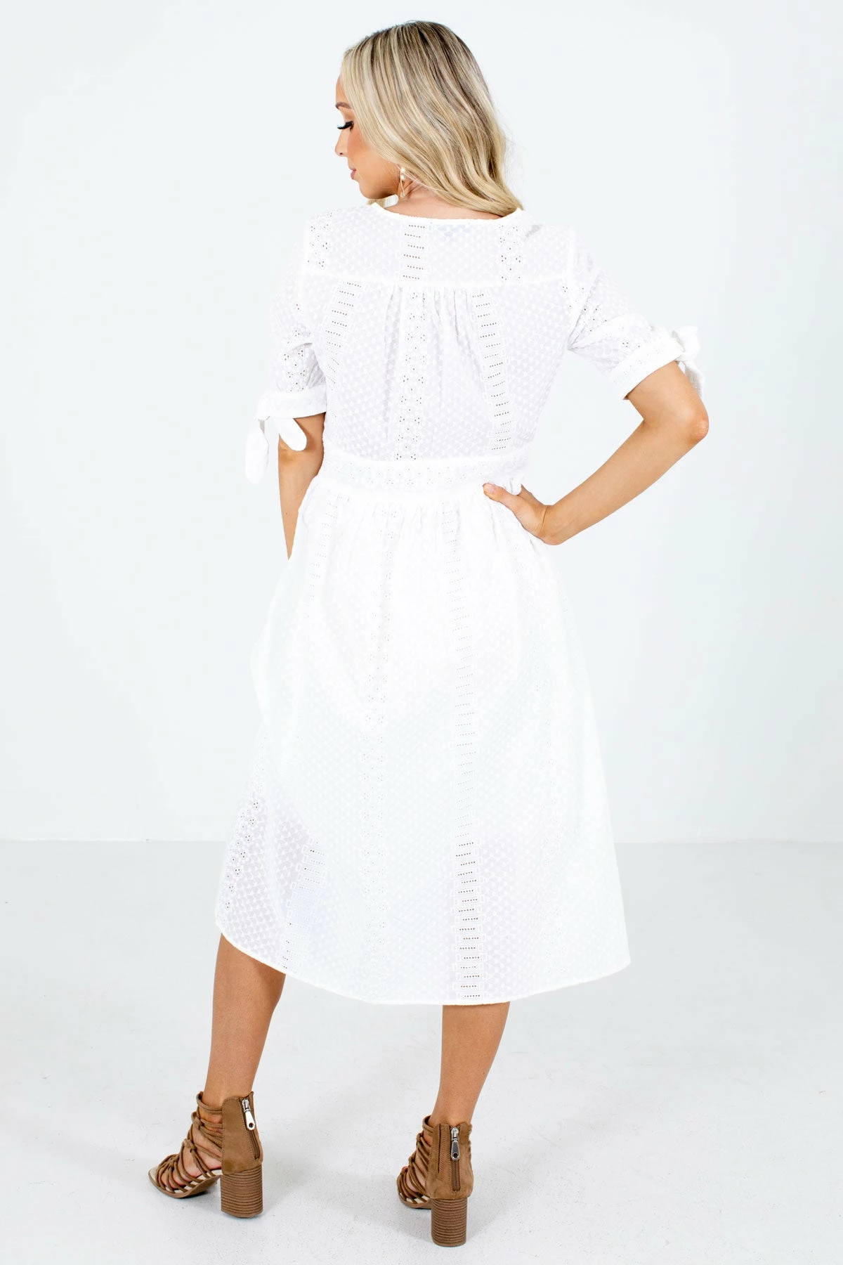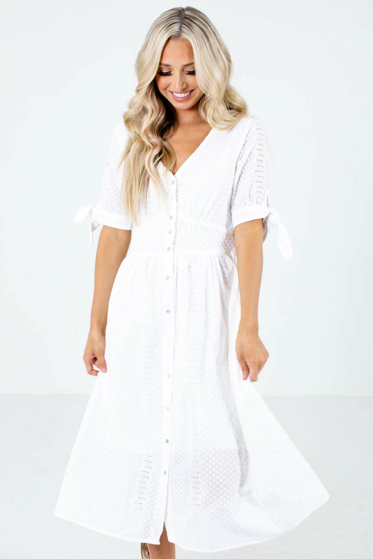 You’ll fall in love with our new Kiss Somebody White Midi Dress! This midi length dress is a solid white color. It features a button-up front, v-neckline, and adorable self-tie sleeve accents! The textured eyelet material is right on trend for the upcoming season. The skirt lining adds the perfect finishing touch! Pair our Kiss Somebody White Midi Dress with heeled sandals to recreate our model’s gorgeous outfit!
