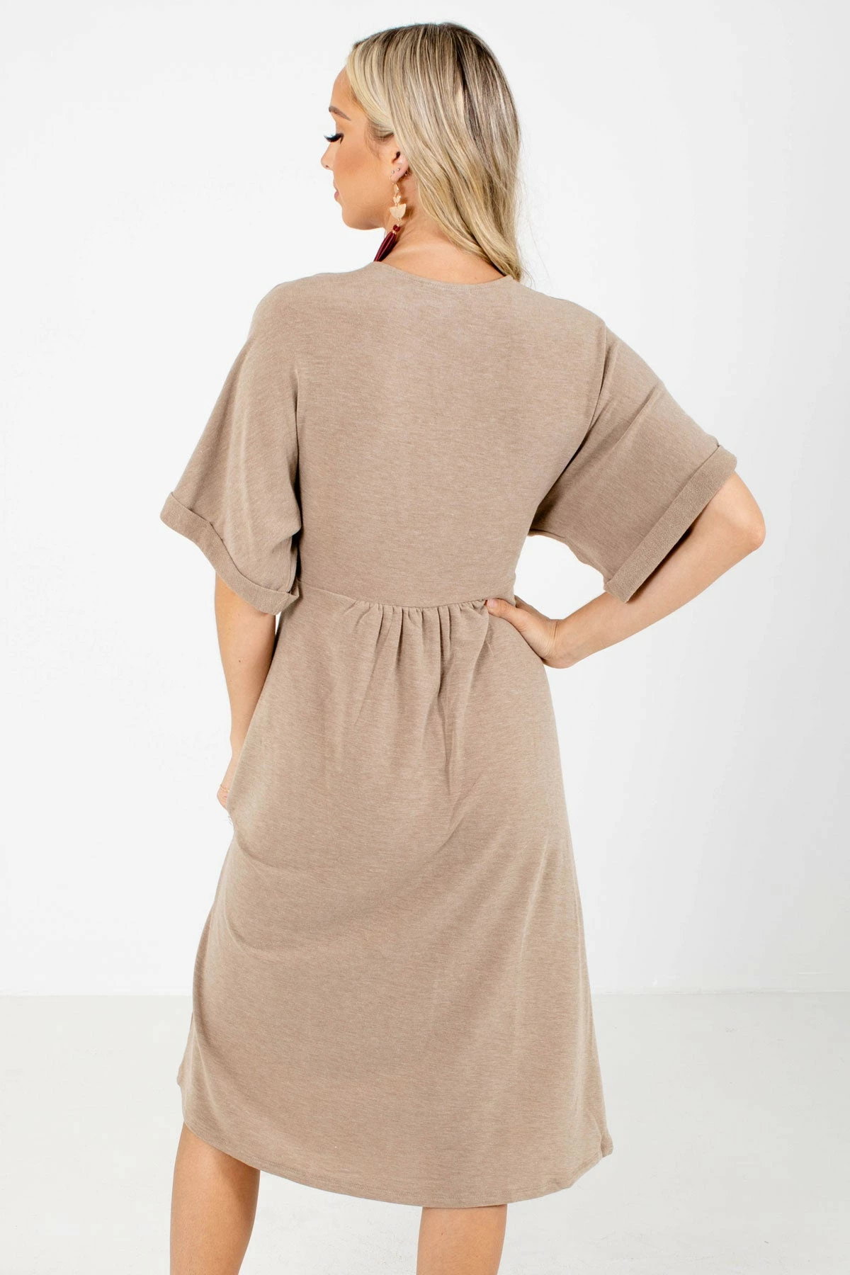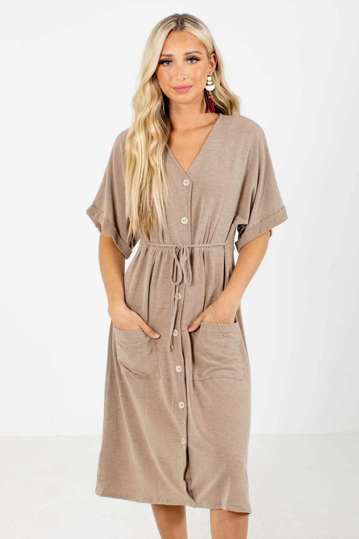 Our new Storm Chaser Brown Midi Dress will quickly become your new go-to piece! This midi length dress is a solid mocha brown color. It features a faux button-up front, waist tie detail, and pockets! We’re in love with the high-quality material that makes this dress so comfortable to wear. The cuffed sleeve perfectly complete the look! Pair our Storm Chaser Brown Midi Dress with platform sandals.