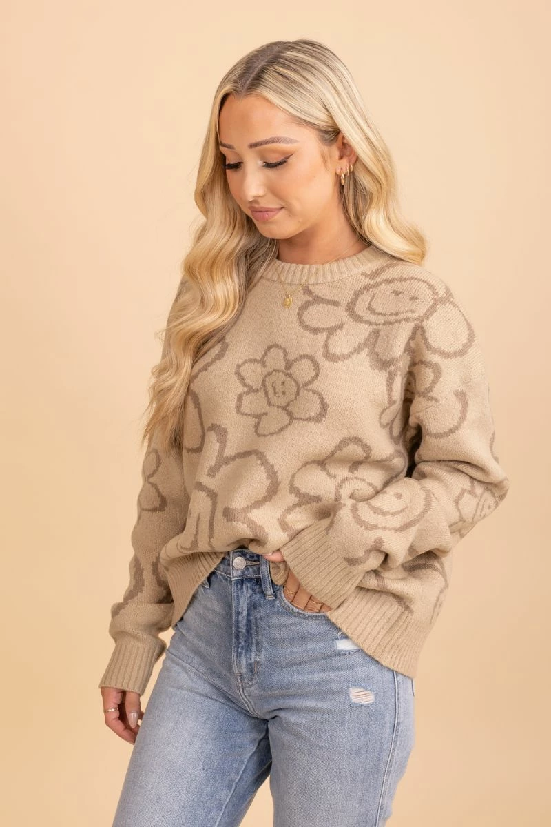 Our See The Light Happy Face Sweater will quickly become your new favorite for the transitioning season! The trendy light brown color and the cutest smiley face flower print details work together to create the cutest piece.