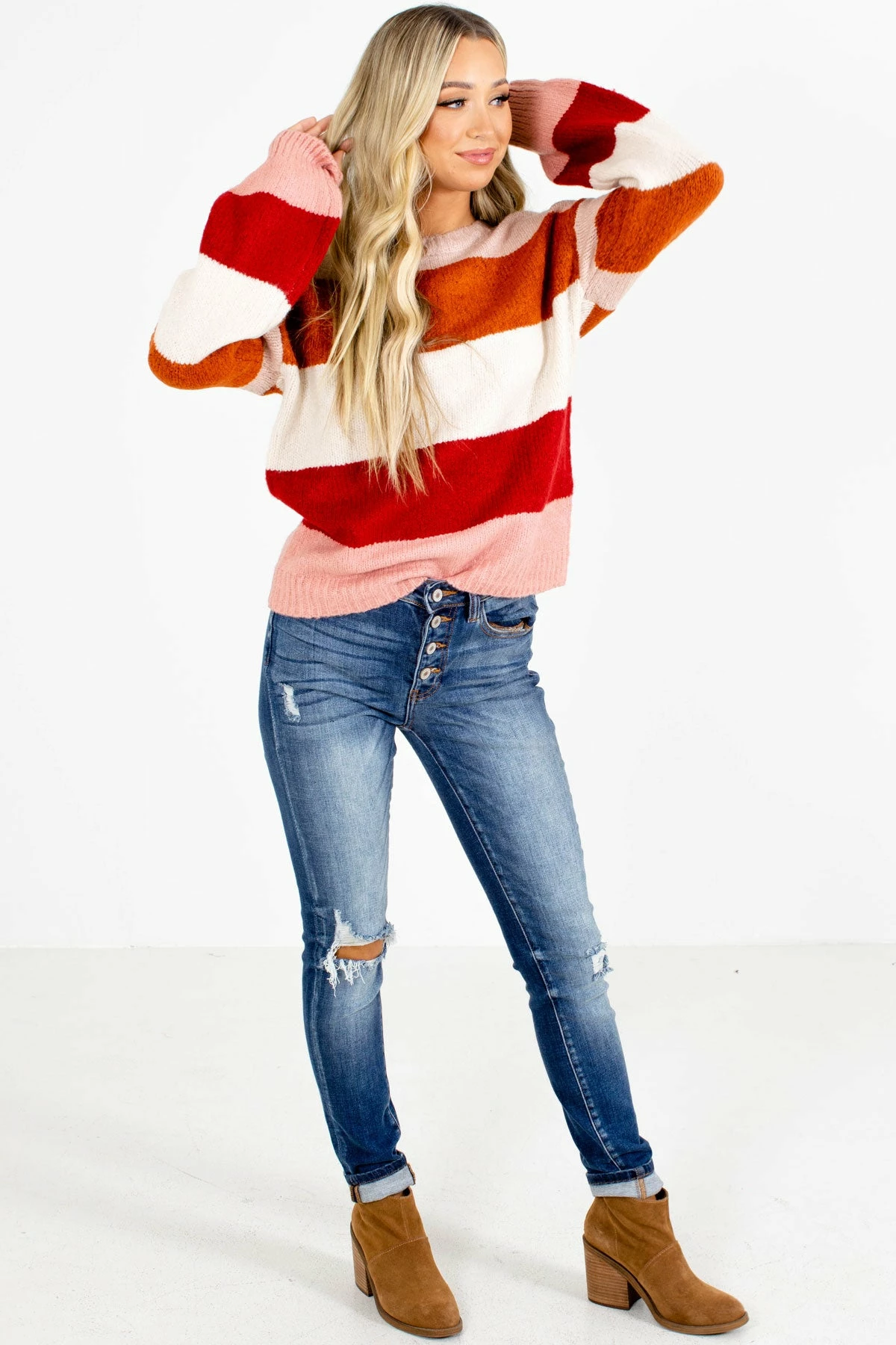 You’ll be so cozy in our new Watermelon Sugar Striped Sweater! This adorable sweater is made of high-quality knit material that creates a comfortable, oversized fit. We’re in love with the round neckline and thick stripes! Pair our Watermelon Sugar Striped Sweater with skinny jeans and your favorite booties to create a cute everyday outfit!